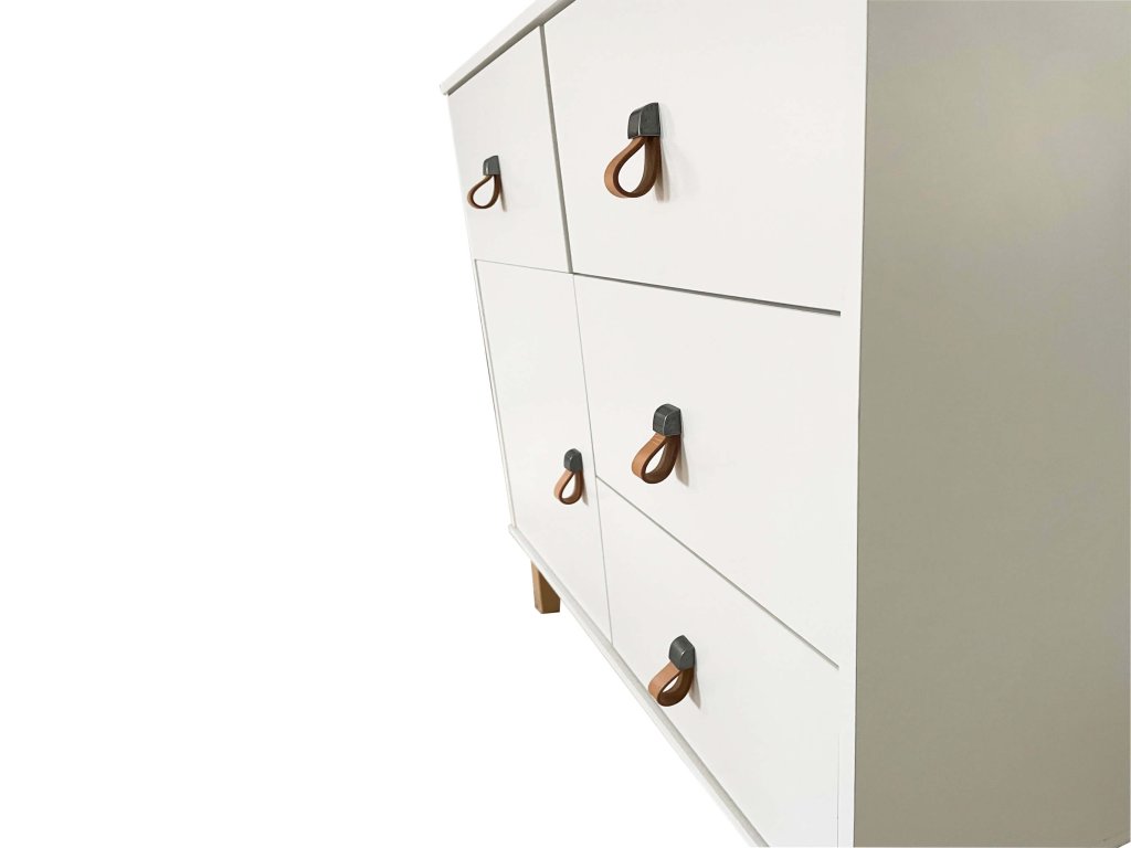 Kovové, drevené, zafrézované, vyfrézované, ale aj žiadne – úchytiek, respektíve rukovätí, je naozaj široká paleta a sú tým, čo dokáže dať nábytku úplne iný vzhľad. Kožené rukoväte sú však niečo, čo rozhodne udrie do očí každej návšteve. Komoda, ale aj šatníková skriňa, písací stôl a ďalšie kúsky nábytku z predmetnej kolekcie sú vybavené práve takýmito úchytmi. Úchyty vďaka očku môžu poslúžiť aj na zavesenie rôznych drobností či personalizovanie nábytku pomocou originálnych doplnkov. Súčasťou predmetnej kolekcie je aj nástenná polica, nočné stolíky či posteľ, vďaka čomu si dokážete vyskladať naozaj originálnu izbu alebo spálňu.