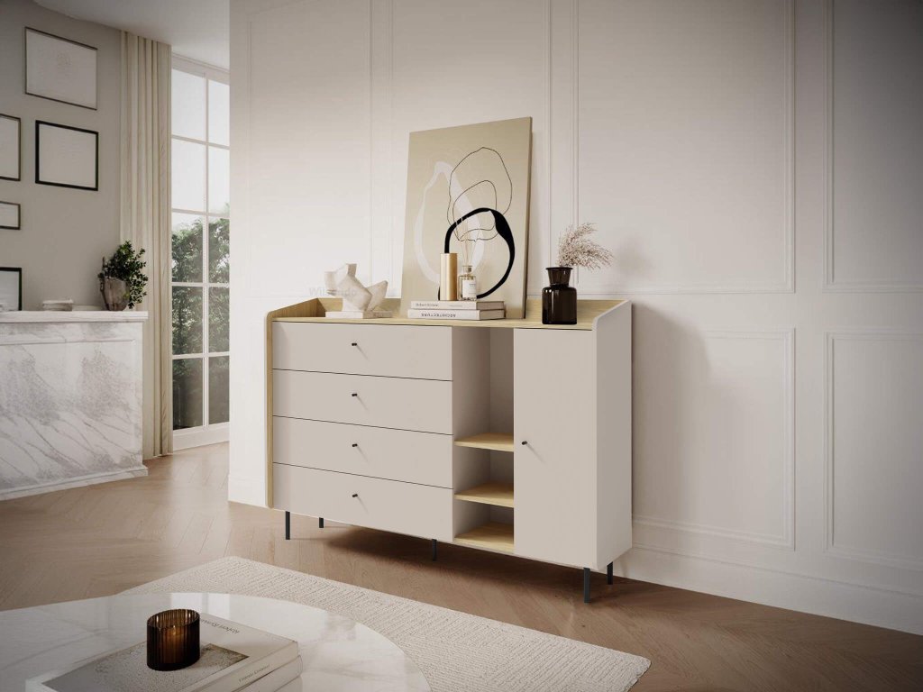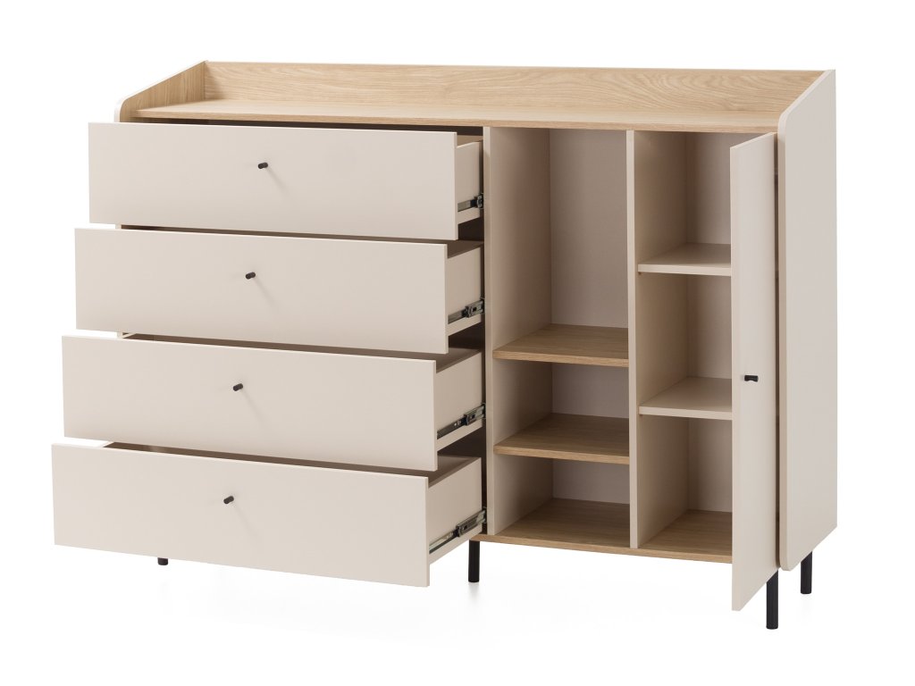 Komoda ALESSIO AE7 v zaujímavej béžovej až v pieskovej farbe s detailami vo farebnom prevedení olejového duba sa skvelo hodí do vášho moderného interiéru. Tento nábytok je navrhnutý tak, aby bol nielen esteticky príťažlivý, ale aj mimoriadne odolný a funkčný. Jeho pevná konštrukcia a kvalitné spracovanie zaručujú dlhodobú životnosť, čo z nej robí výbornú investíciu do vášho domova. Pestrý úložný priestor je ďalšou silnou stránkou tejto komody. Na ukladanie vecí je možné využiť až 4 priestorné zásuvky, skrinku s dvoma poličkami alebo otvorený policový priestor. Táto komoda to má skrátka všetko.