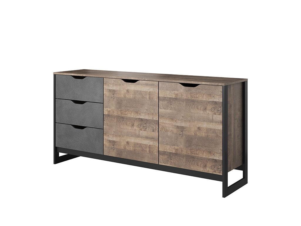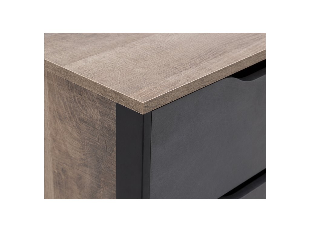 Nábytok z kolekcie BERGEN v modernom industriálnom štýle vdýchne vášmu interiéru jedinečnosť. Nábytok je vyrobený z vysoko kvalitnej laminovanej dosky (DTD) o hrúbke 16 mm, ktorá je odolná voči poškriabaniu, vlhkosti a vysokej teplote. Nábytok sa vyznačuje kvalitnými ABS hranami, bezúchytovým systémom, otváranie skriniek pomocou ozdobných výrezov. Nábytok je vyhotovený vo farbe dubového dreva s jemne poškriabaným tmavošedým kovom, ktorý dodá interiéru jedinečnú atmosféru podkrovia. Celý povrch je zvýraznený čiernym rámom z prírodnej preglejky. Celá kolekcia pozostáva z viacerých komponentov, ktoré si môžete vyskladať podľa vlastných predstáv.