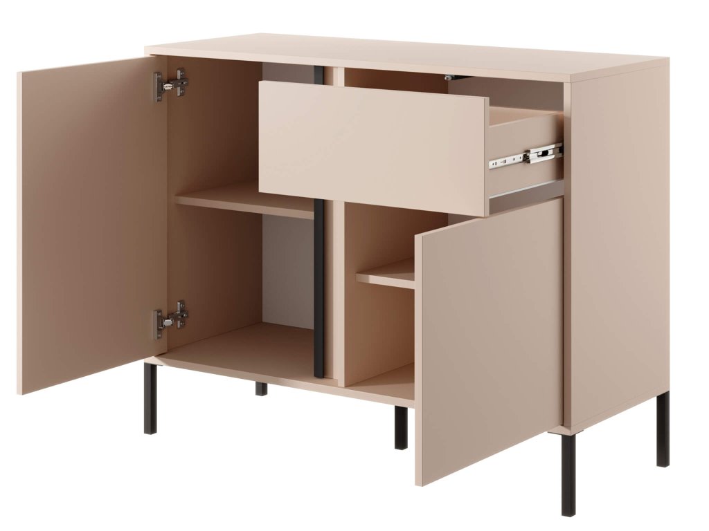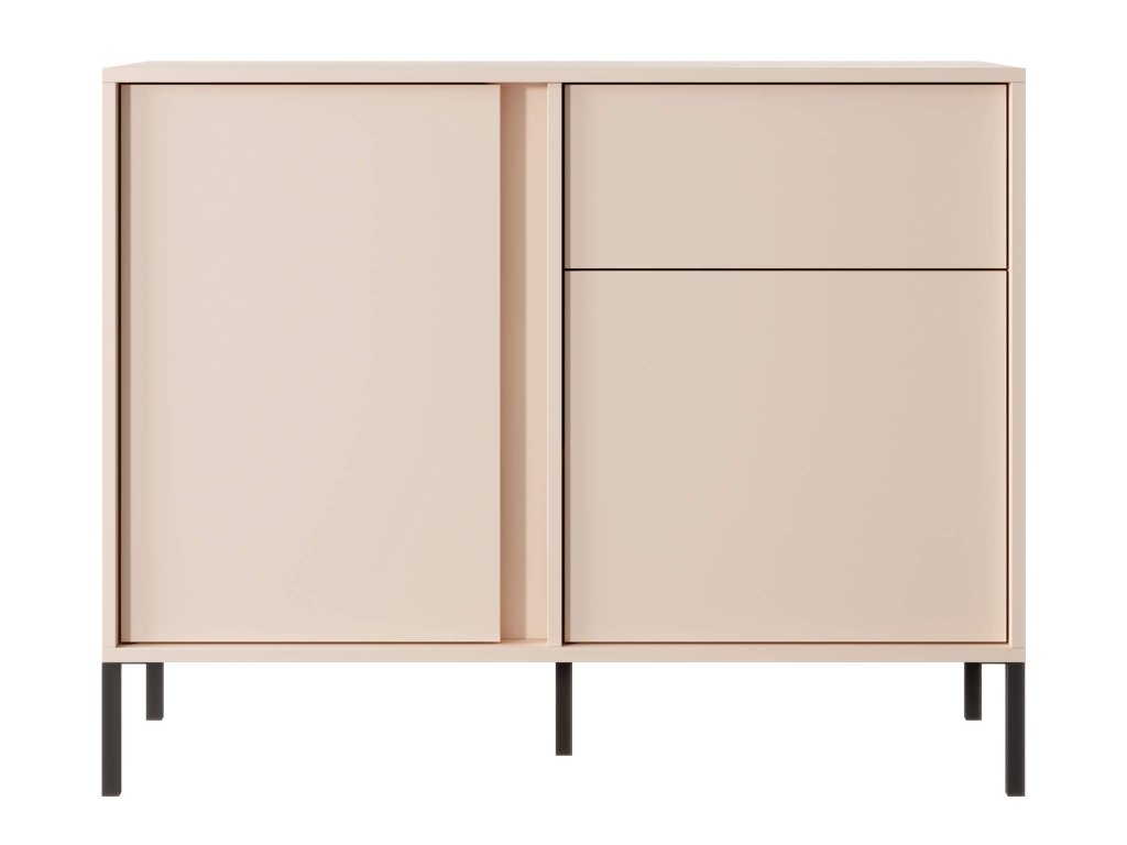 Komoda Dast je moderný kus nábytku, ktorý sa hodí do každej modernej obývačky. Jeho jemná béžová farba je príjemná pre oko a dokonale zapadne do interiéru, ktorý preferuje neutrálne farby. Čierne kovové nohy dodávajú komode elegantný a sofistikovaný vzhľad. Komoda Dast má dve skrinky, v ktorých sú dokopy štyri police, ponúkajúce dostatok miesta na uskladnenie rôznych predmetov, ako sú knihy, obrazy, rôzne dekorácie a iné veci. Jedna zásuvka na pravej strane komody poskytuje ďalší úložný priestor pre rôzne drobnosti. Otváranie skriniek a zásuvky je realizované systémom zatlačenia, čo znamená, že komoda Dast sa neotvára klasickým ťahaním. Tento štýlový spôsob otvárania dodáva komode jedinečný a moderný charakter. Je vyrobená z kvalitnej laminovanej dosky a disponuje ABS hranami. To zaručuje, že komoda bude slúžiť po mnoho rokov a bude odolná proti poškodeniu a opotrebeniu.
