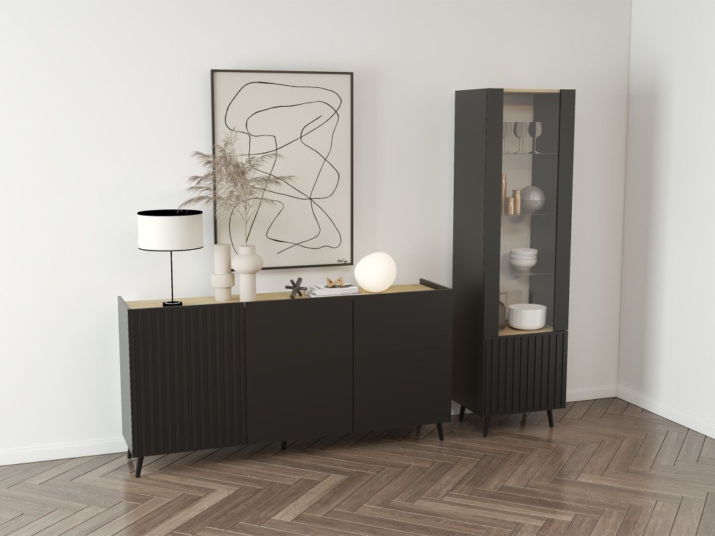 Čierna komoda Goja v sebe spája štýlový vzhľad a praktické riešenie pre každodenné používanie. Tri priestranné skrinky s vnútornými policami ponúkajú dostatok miesta na uloženie oblečenia, dokumentov či doplnkov do obývačky. Elegantné frézované čelá v čiernom prevedení dopĺňajú detaily v dekore dub Cremona, ktoré interiéru dodávajú jemné teplo a prirodzený kontrast. Vďaka bezúchytkovému systému pôsobí komoda čisto, nadčasovo a dokonale zapadne do rôznych štýlov interiérov – od minimalistických až po industriálne.