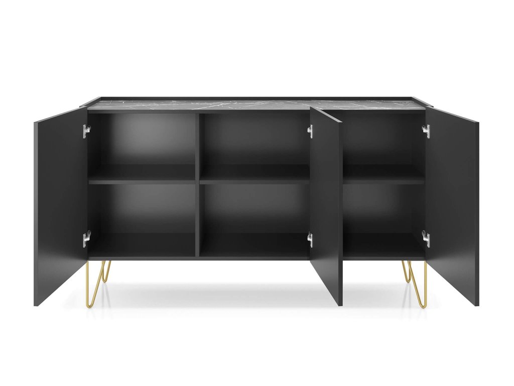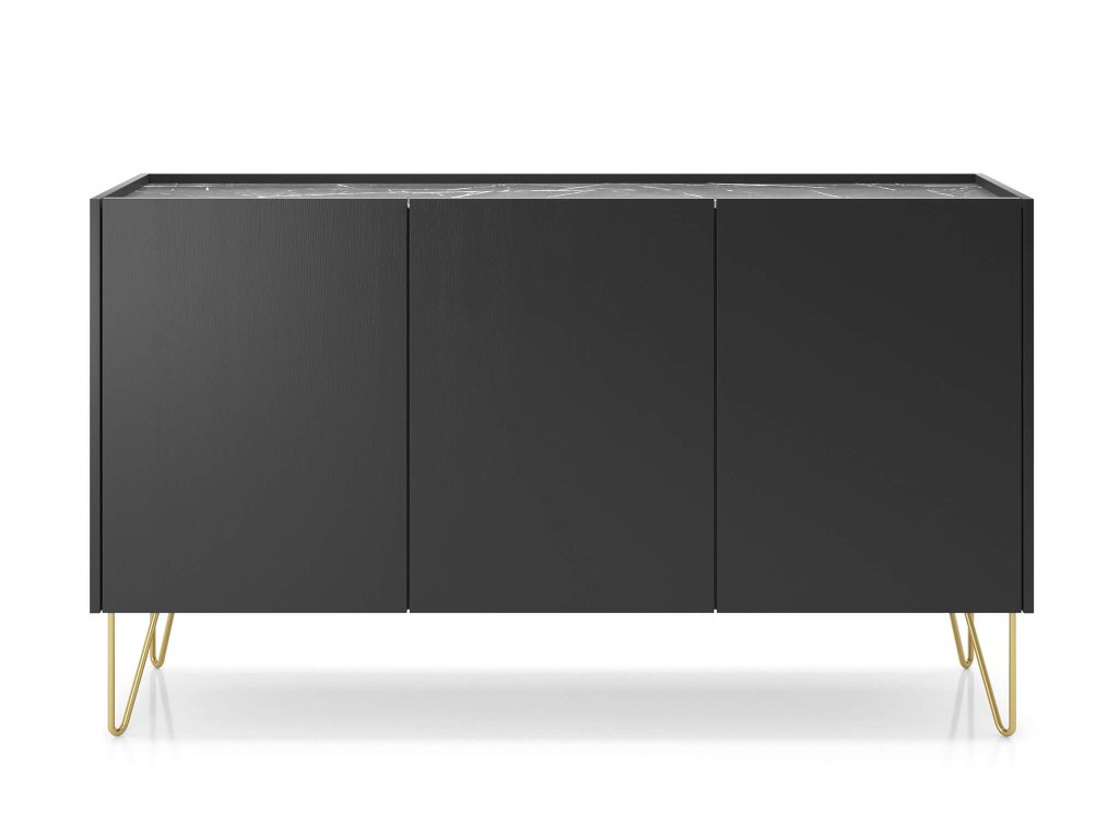 Trojdverová komoda Harmony v čiernej farbe s vrchnou doskou s imitáciou čierneho mramoru má matný povrch. Dvierka majú bezúchytové otváranie vďaka zvýšenému okraju. Priestranná komoda Harmony poskytne dostatok úložného priestoru v obývacej izbe, predsieni alebo aj spálni.