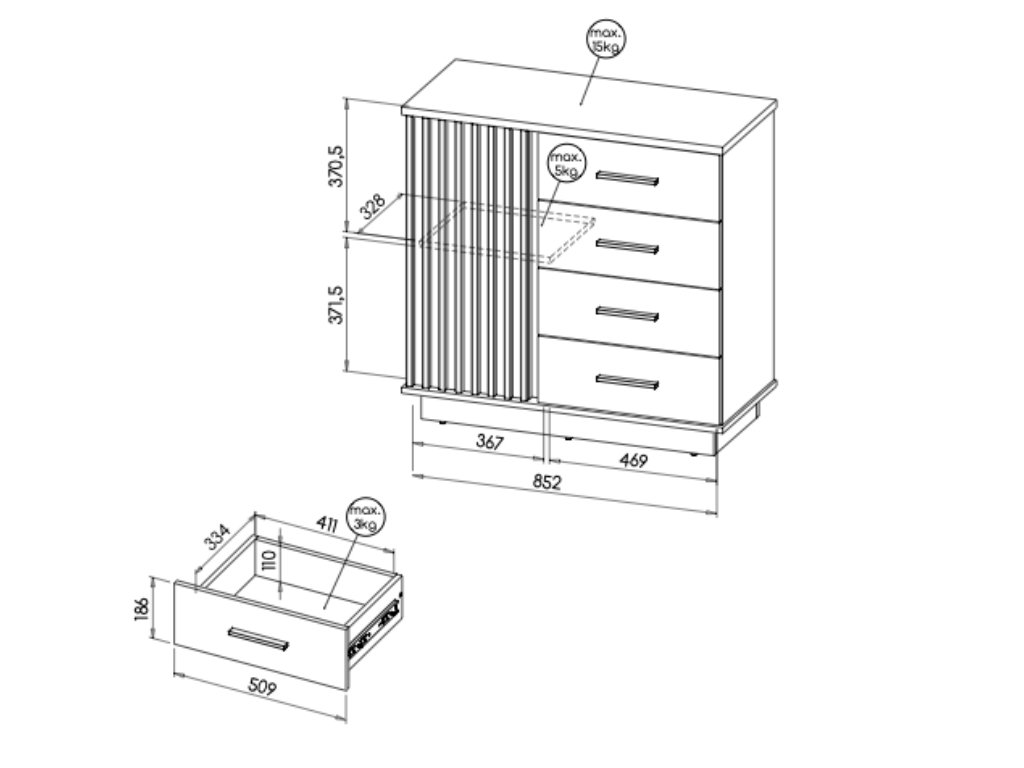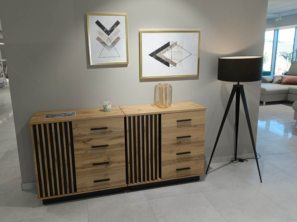 Komoda LAMELO 90 – pozostáva z dvoch častí. Na pravej strane komody sú štyri zásuvky. Pravá strana pozostáva z lamelových bezúchytových dverí, za ktorými je polica rozdeľujúca tento priestor na dve časti.