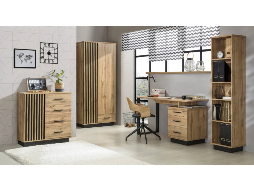 Nábytok z kolekcie LAMELO je nadčasový kúsok, ktorý zvýrazní každú časť interiéru. Nábytok dokonale splní svoju funkciu v obývačke, kancelárii alebo v jedálni. Kolekcia Lamelo pozostáva z farebnej kombinácie dub wotan/čierna, ktorá prináša do každého domova neobyčajné prvky luxusu. Hrany sú upravené kvalitnou PVC dyhou, ktorá ochraňuje nábytok pred opotrebením. Nábytok disponuje bezúchytovým systémom v jednej časti, ktorý je doplnení o plastové úchyty v čiernej farbe na pravej strane.