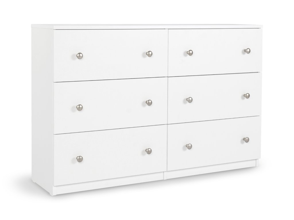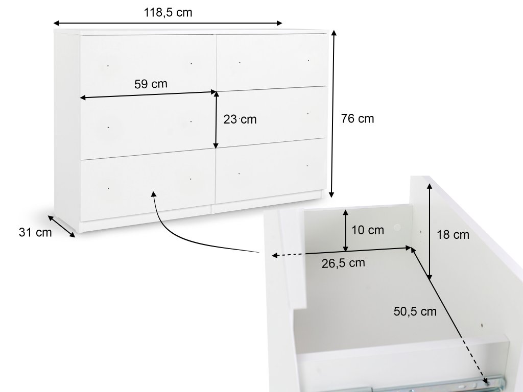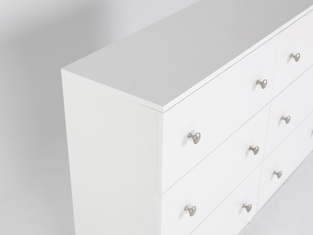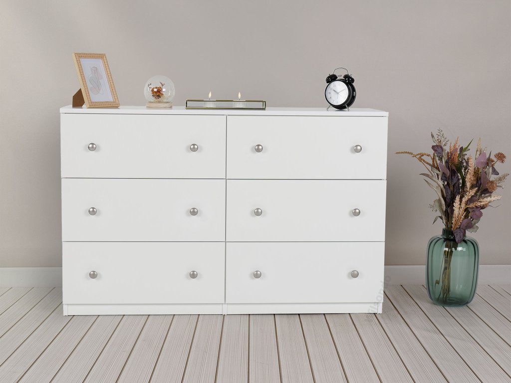 Pridajte svojmu interiéru eleganciu a praktickosť s komodou Leo 120 v čistej bielej farbe so striebornými matnými úchytkami. Tento široký kus nábytku, vybavený šiestimi priestrannými zásuvkami, je ideálny na prehľadné usporiadanie oblečenia, dokumentov alebo iných potrebných vecí. Minimalistický dizajn a kontrast bielej farby so striebornými úchytkami z nej robia nadčasový doplnok, ktorý sa hodí do každého interiéru. S komodou Leo 120 získate nielen praktický úložný priestor, ale aj elegantný prvok, ktorý sa dokonale začlení do vášho domova.