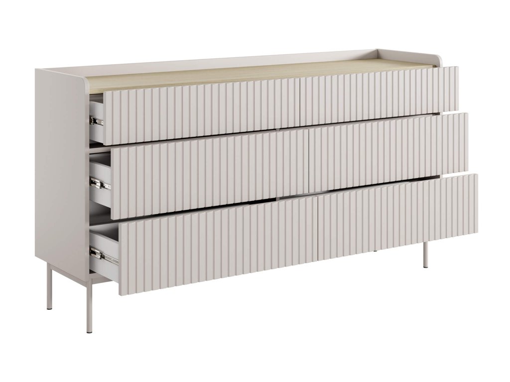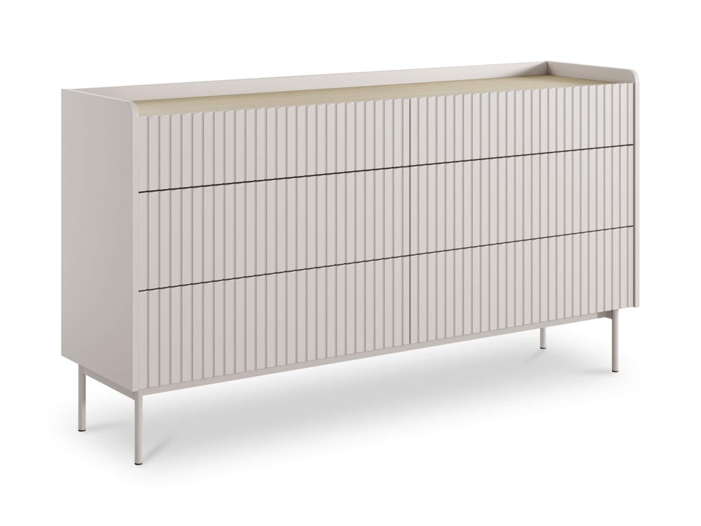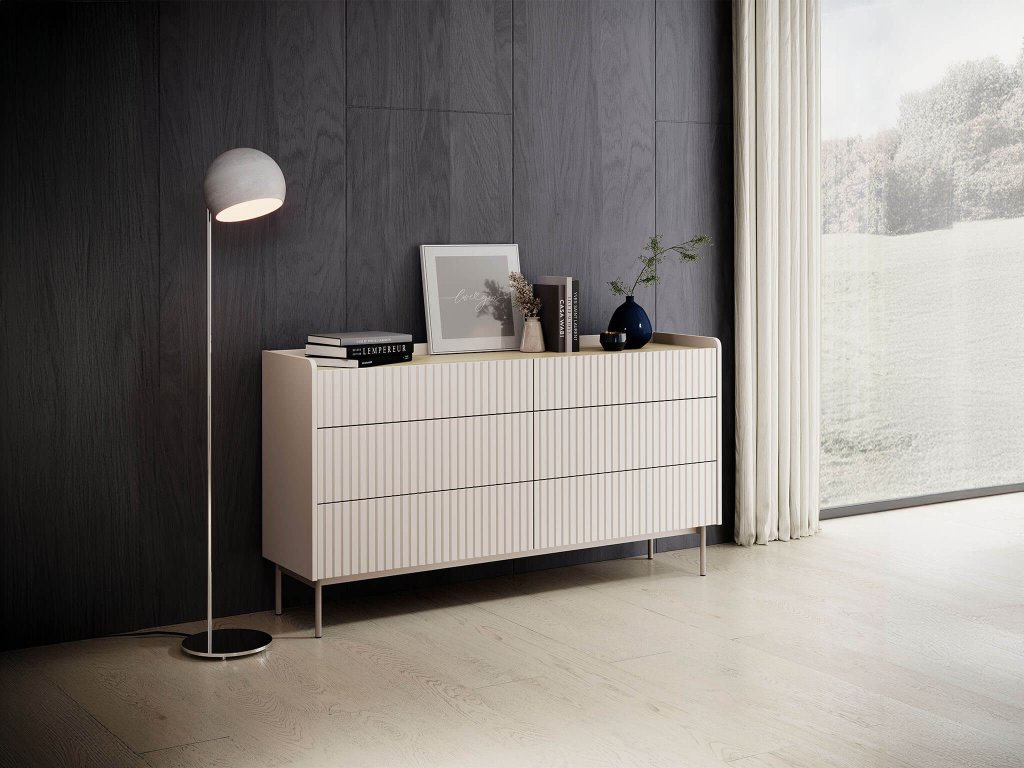 Maximalizujte svoj úložný priestor bez kompromisov v štýle s našou širokou komodou LEVEL so 6 zásuvkami. Sofistikovaná farebná kombinácia béžovej a dubu Scandi dodá každému priestoru eleganciu. Tento krásne spracovaný kúsok kombinuje moderné dizajnové prvky s praktickou funkčnosťou, vďaka čomu bude dokonalým doplnkom do každej miestnosti vo vašej domácnosti.