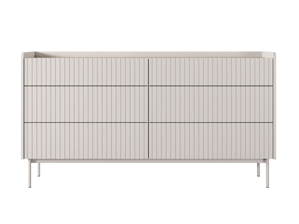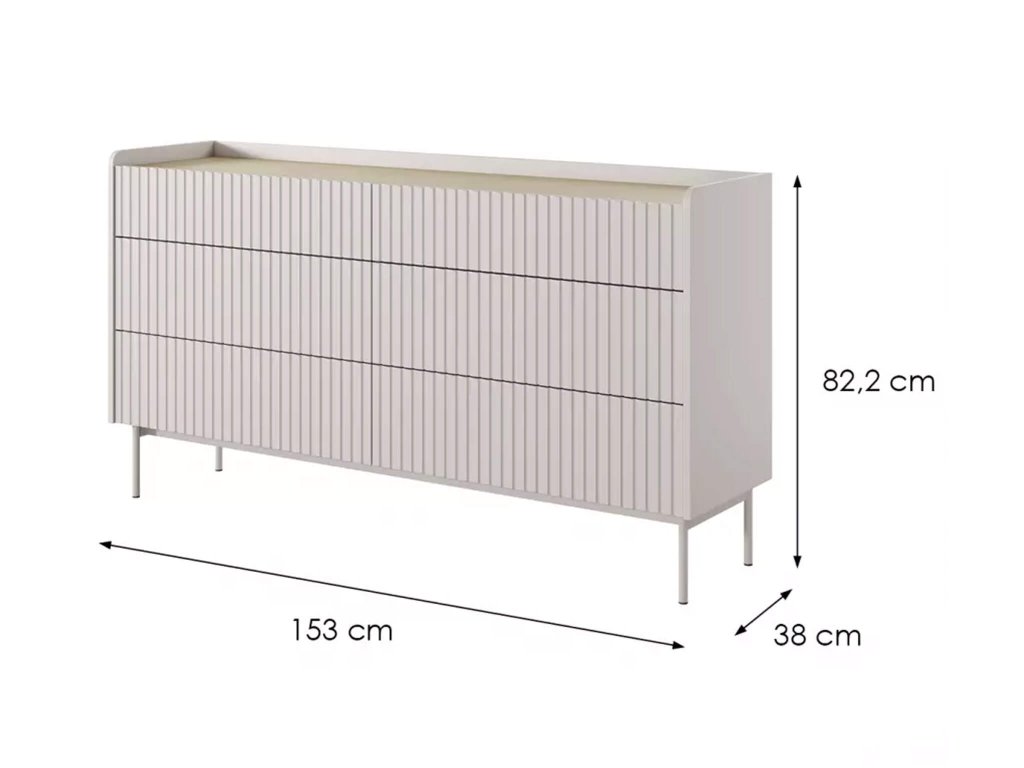 Telo komody je vyrobené z kvalitnej laminovanej drevotrieskovej dosky E05 hrúbky 16 mm, ktorá zaisťuje odolnosť. Predné panely sú vyrobené z odolného MDF s hrúbkou 18 mm. Povrchová úprava je zakončená ABS hranou v rovnakej farbe ako doska. Dizajn bez rukoväte si zamilujete vďaka mechanizmu push-to-open. Tento mechanizmus umožňuje otvorenie zásuvky po jednoduchom zatlačení. Doprajte si čistý vzhľad a zároveň ľahký prístup k vašim veciam so šiestimi plne výsuvnými HDF zásuvkami tejto komody. Kovové nohy v zodpovedajúcej béžovej farbe poskytujú stabilitu a moderný vzhľad.