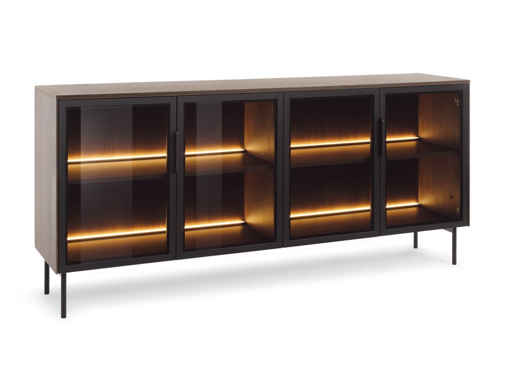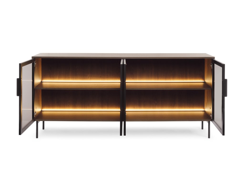 Komoda LIMU 181 4D v matnom dekore dub Dunin s čiernymi prvkami prináša do obývačky moderný a elegantný vzhľad. Predné časti komody sú vyrobené z tvrdeného kaleného skla s čiernymi MDF rámami, čo jej dodáva nadčasový charakter. Vnútorné poličky poskytujú praktický úložný priestor, zatiaľ čo teplé biele LED osvetlenie zvýrazňuje obsah a vytvára príjemnú atmosféru.