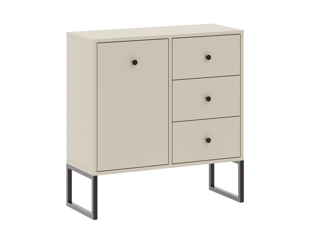 Úzka komoda Linea 1D3S v kašmírovej farbe je vyrobená z kvalitnej laminátovej dosky s hrúbkou 16 mm, doplnená o ABS hrany pre dlhšiu životnosť. Jej elegantný vzhľad umocňujú matné čierne kovové nožičky a moderné gombíkové úchytky. Komoda Linea ponúka tri priestranné zásuvky v strednej časti a jedny dvierka, za ktorými sa skrýva praktická polica pre ukladanie rôznych predmetov. Tento efektívny dizajn a funkčnosť robia z komody skvelý doplnok do každej obývačky či spálne.
