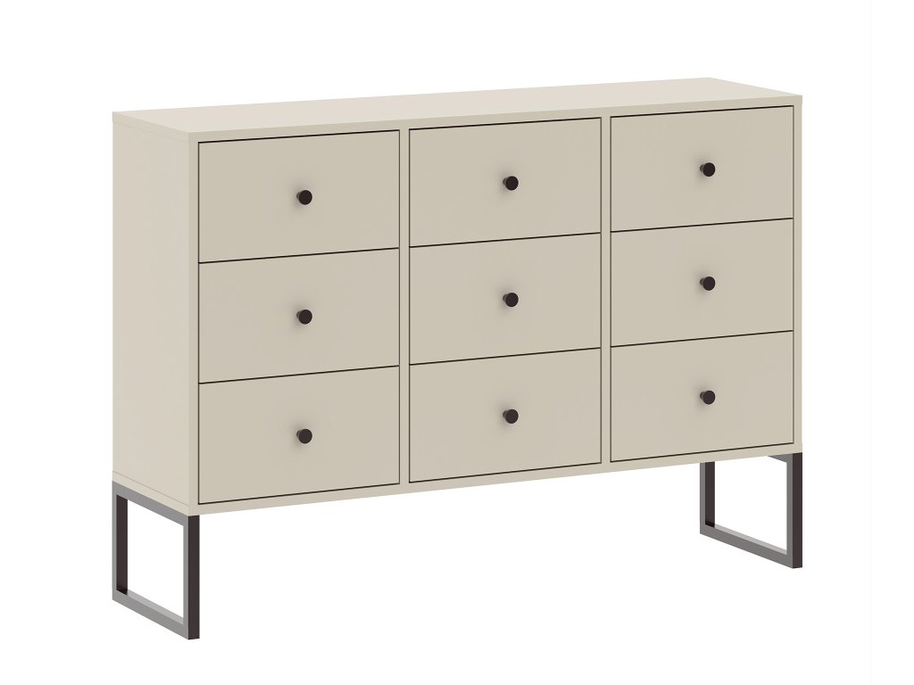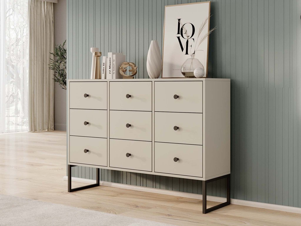 Kašmírová šuflíková komoda do obývačky je vyrobená z odolnej laminátovej dosky s hrúbkou 16 mm, ktorú chráni ABS hrana pre dlhšiu životnosť. Elegantný kontrast vytvárajú matné čierne kovové nožičky a štýlové gombíkové úchytky, ktoré komode dodávajú moderný šmrnc. Šuflíková komoda 9S ponúka deväť priestranných zásuviek, ktoré vám poskytnú dostatok miesta na všetko, čo potrebujete mať po ruke. Tento kúsok kombinuje praktickosť a nadčasový dizajn, vďaka čomu je ideálnym doplnkom do každej obývačky.