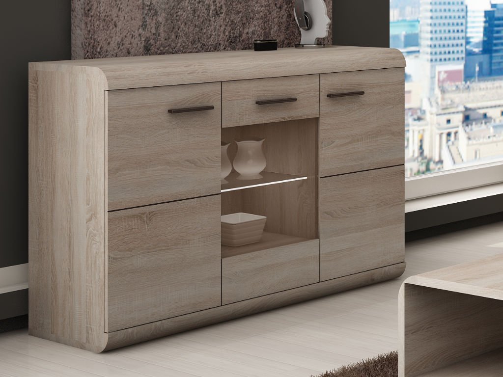 Praktická komoda LINK 120 3D je trojdverová komoda, kde stredné dvierka majú svoju strednú časť presklenú a za nimi sa nachádza jedna sklenená polica. Po bokoch komody sú dvierka, kde za každými z nich sa ukrýva jedna polica. Okrem toho aj vrchnú dosku komody môžete využiť ako odkladací priestor na rôzne maličkosti, ako sú fotografie, kvety alebo iné dekorácie. LED osvetlenie nie je súčasťou komody!