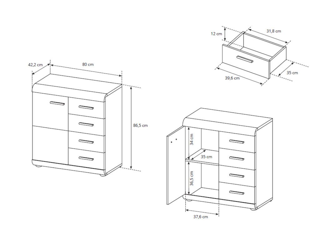 Komoda Link 80 je tvorená štyrmi zásuvkami na pravej strane a dvierkami na ľavej strane, za ktorými je umiestnená polica. Vrchná doska môže taktiež slúžiť ako úložný priestor pre Vaše oblúbené dekorácie.