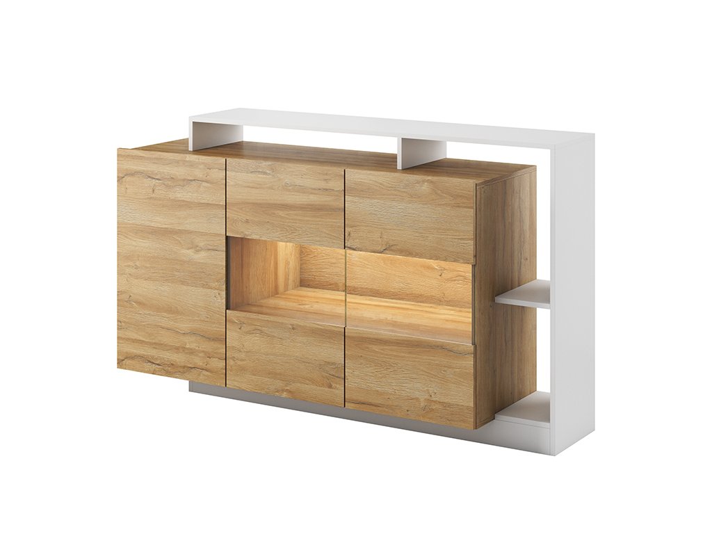 Zaujímavá komoda Alva je vyrobená z vysoko kvalitnej laminovanej dosky (DTD) o hrúbke 16 mm, ktorá je odolná voči poškriabaniu, vlhkosti a vysokej teplote. Nábytok sa vyznačuje kvalitnými ABS hranami a bezúchytovým systémom. Je vyrobená v krásnej kombinácii neutrálnej bielej farby s dubom grandson. Komoda je tvorená troma dvierkami, za ktorými sa dokopy ukrývajú tri police, jednou otvorenou policou na ľavej strane komody a aj vrchné dosky môžu byť využité ako odkladací priestor. LED osvetlenie nie je súčasťou komody!