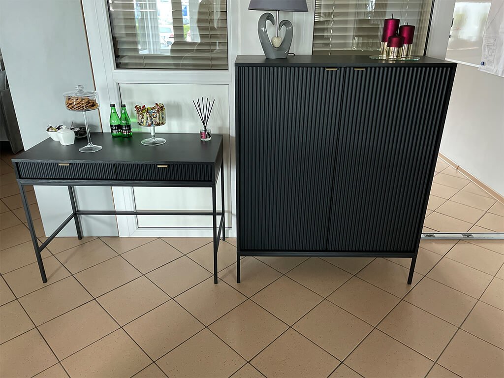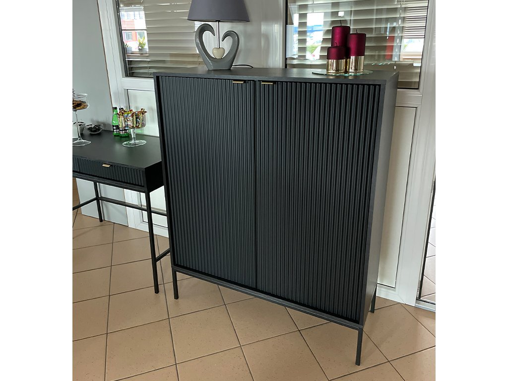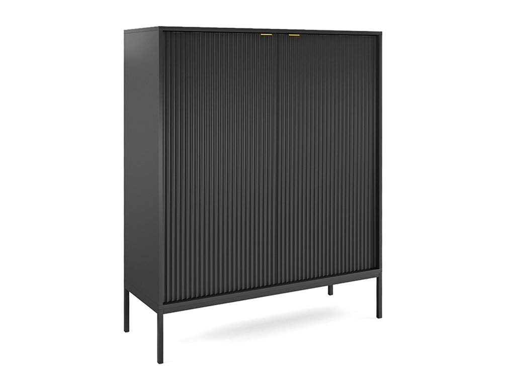 Nesmierne elegantná a štýlová komoda Nova K104 je ideálnou voľbou pre milovníkov moderného dizajnu. Jej ozdobné drážkované čelá sa dokonale dopĺňajú s brúsenými zlatými úchytkami z hliníka, ktoré komode dodávajú luxusný a výnimočný vzhľad. Ľahkosť a vzdušnosť jej dodáva čierna kovová konštrukcia s vysokými nožičkami, vďaka čomu pôsobí moderne a esteticky v každom priestore – v obývačke, predsieni, jedálni aj spálni. Korpus komody je vyrobený z laminovanej DTD dosky a drážkované čelá z kvalitnej MDF, čo zaručuje pevnosť a dlhú životnosť. Priestranná komoda Nova K104 ponúka bohatý úložný priestor – za dvomi dvierkami sa nachádzajú štyri praktické police, ktoré pomôžu udržať vo vašom interiéri prehľad a poriadok.