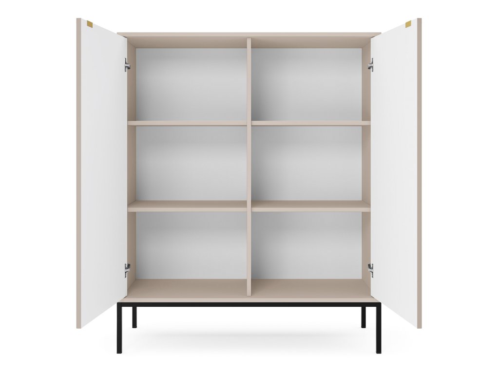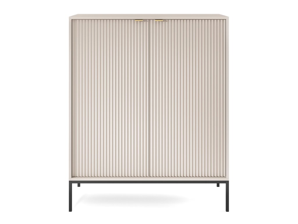 Komoda Nova K104 v kašmírovej farbe prinesie do vašej obývačky alebo spálne elegantný vzhľad a mimoriadne moderný charakter. Predné plochy zdobí vertikálne frézovanie, ktoré vytvára atraktívnu textúru a zvýrazňuje prémiový dizajn. Ozdobné zlaté brúsené úchytky dodávajú celku jemný luxus a dokonale ladia s kašmírovým odtieňom. Vysoké čierne kovové nohy zabezpečujú stabilitu. Kvalitné prevedenie tvorí základ tejto komody. Korpus z laminovanej DTD dosky je pevný a odolný, zatiaľ čo reliéfne čelá z MDF dosky pôsobia esteticky a sú spracované do najmenšieho detailu.