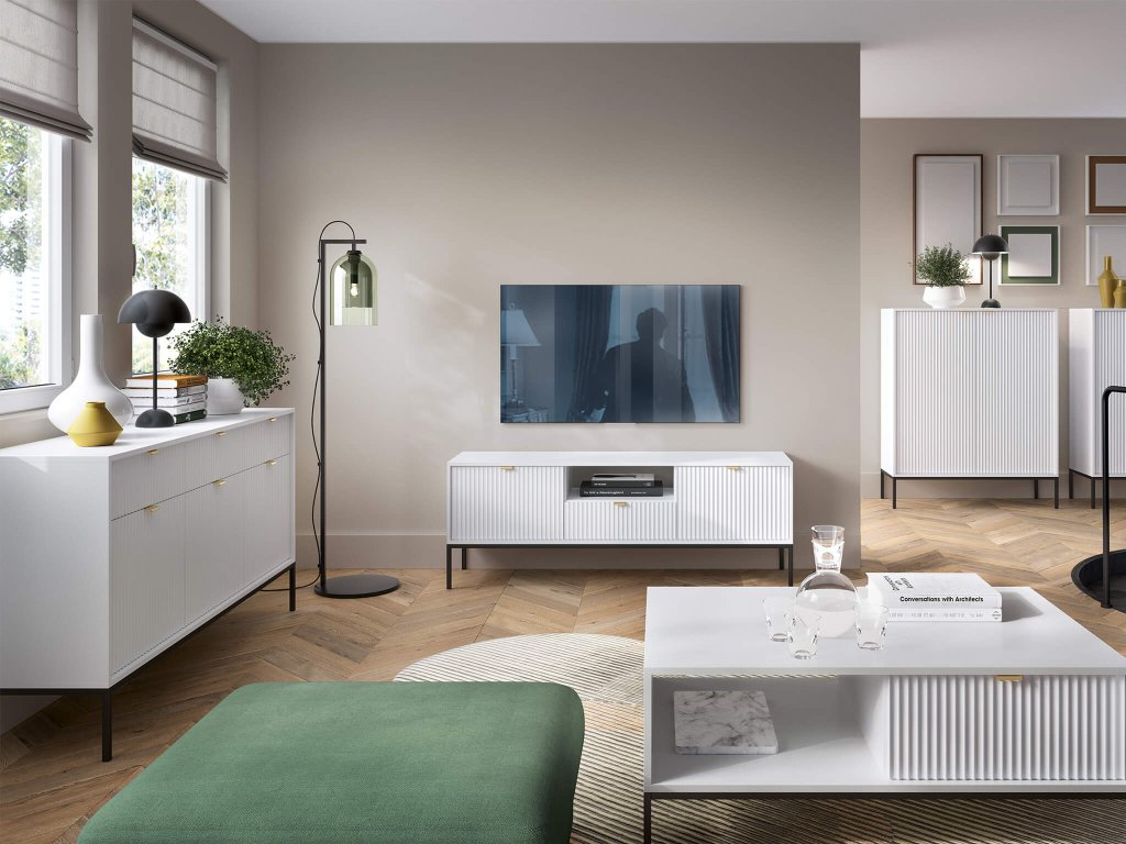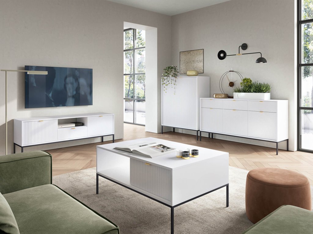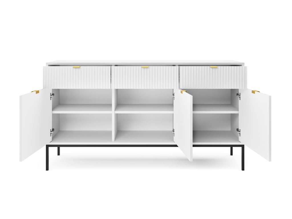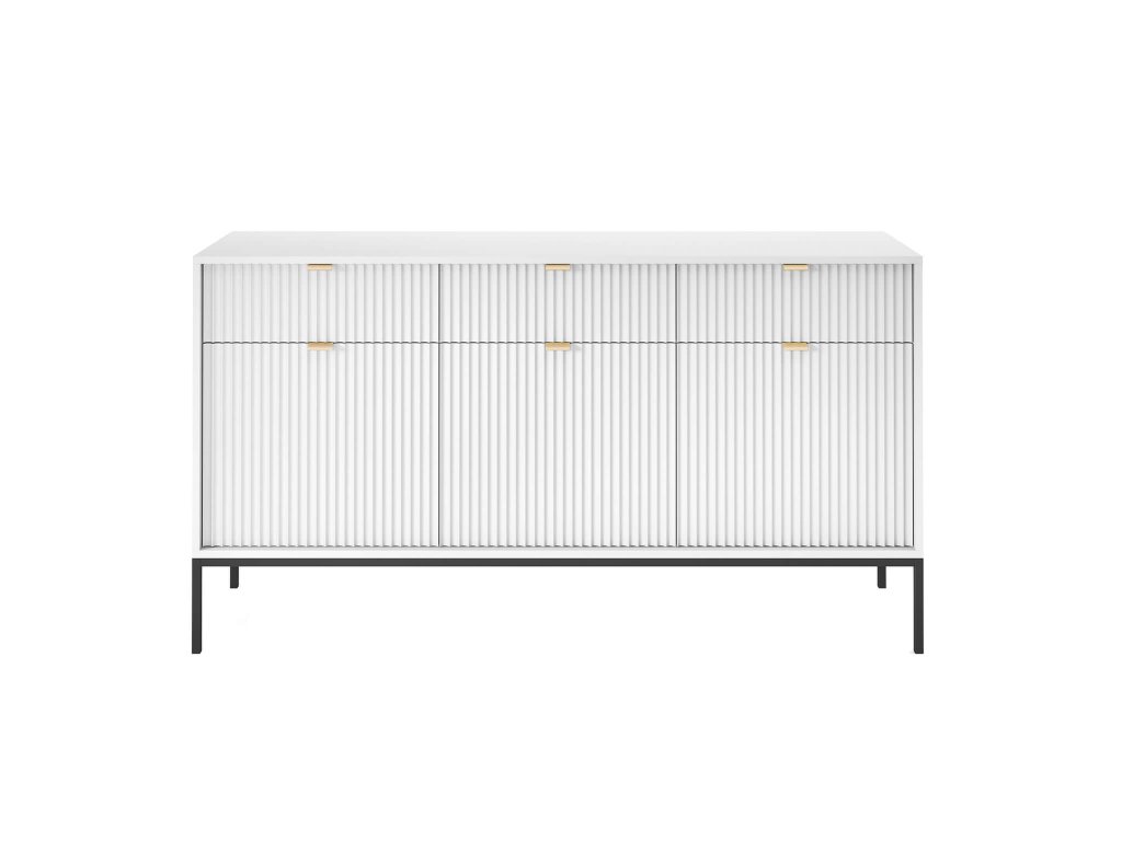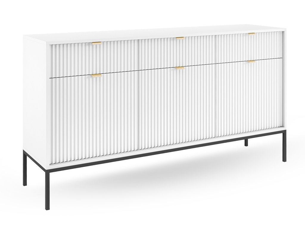 Biela komoda Nova KSZ154 je elegantným a štýlovým doplnkom do moderného interiéru. Jej ozdobné drážkované čelá dokonale ladia s brúsenými zlatými úchytkami z hliníka, ktoré komode dodávajú sofistikovaný a nadčasový vzhľad. Ľahkosť a vzdušnosť nábytku zvýrazňuje čierna kovová konštrukcia s vysokými nožičkami, vďaka čomu sa komoda hodí do obývačky, predsiene, jedálne aj spálne. Korpus komody je vyrobený z laminovanej DTD dosky, zatiaľ čo drážkované čelá z kvalitnej MDF zaručujú pevnosť a odolnosť. Komoda Nova KSZ154 ponúka veľmi praktický úložný priestor – tri zásuvky nad priestorom s tromi dvierkami a za každými dvierkami jedna polica umožňujú prehľadne uložiť všetky veci a udržať interiér elegantne usporiadaný.