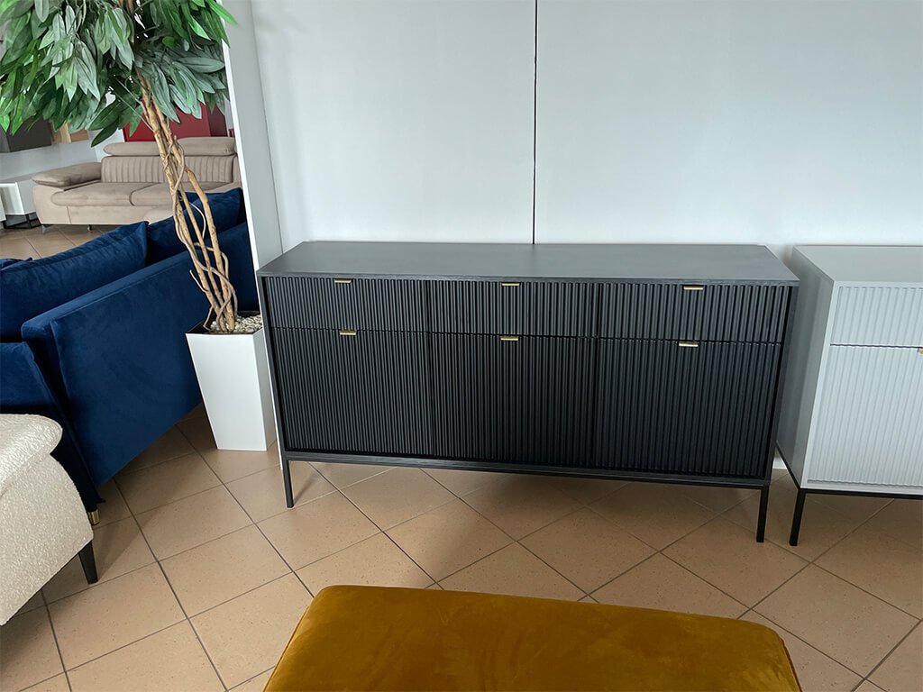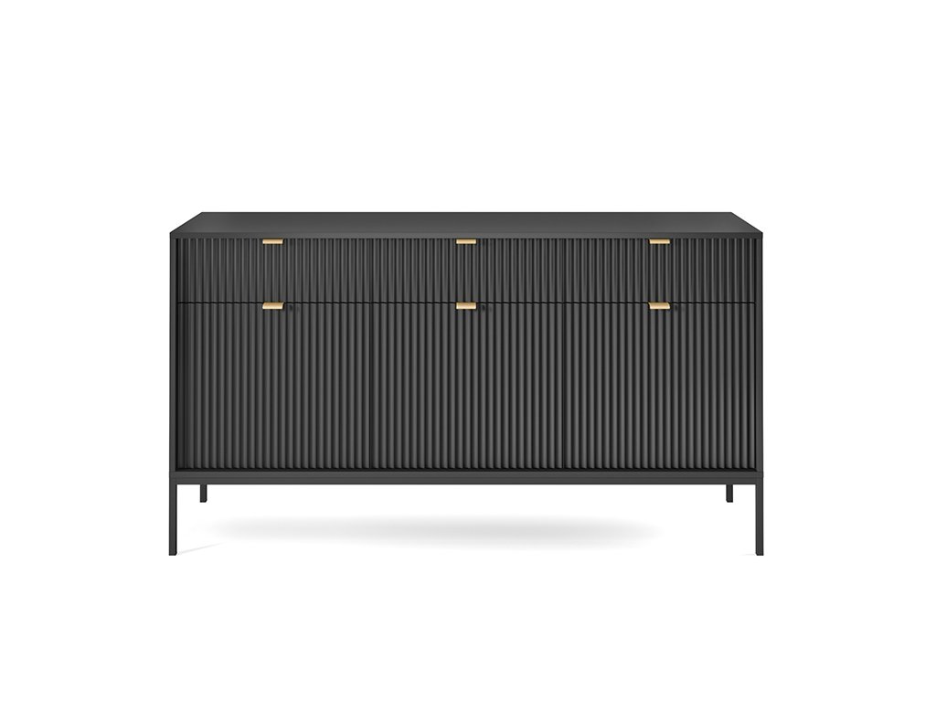 Komoda NOVA dokonale vynikne v bytoch, kde na niektorých stenách či iných kusoch nábytku nájdeme čoraz obľúbenejšie lamely. Vďaka strohému, ale za to pútavému dizajnu sa hodí do moderných, ale aj tradičnejšie zariadených obývačiek. Čierna farba dokonale podčiarkne luxusný dojem, no komodu si môžete objednať aj v dvoch ďalších odtieňoch v prípade, že máte radi svetlejšie farby a vzdušnejšie priestory. Komoda najlepšie vynikne spolu s ďalšími modelmi nábytku z rovnakej kolekcie. Objednať si môžete aj celú obývačkovú zostavu NOVA v preferovanej farbe za atraktívnu cenu. Priestranná komoda Nova KSZ154 vám pomôže rozumne a elegantne zariadiť interiér. S jej nesmierne bohatým úložným priestorom si každá vec nájde svoje miesto. Nad priestorom s tromi dvierkami sa nachádzajú tri zásuvky. Za každými dvierkami sa ukrýva jedna polica.