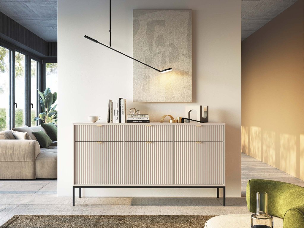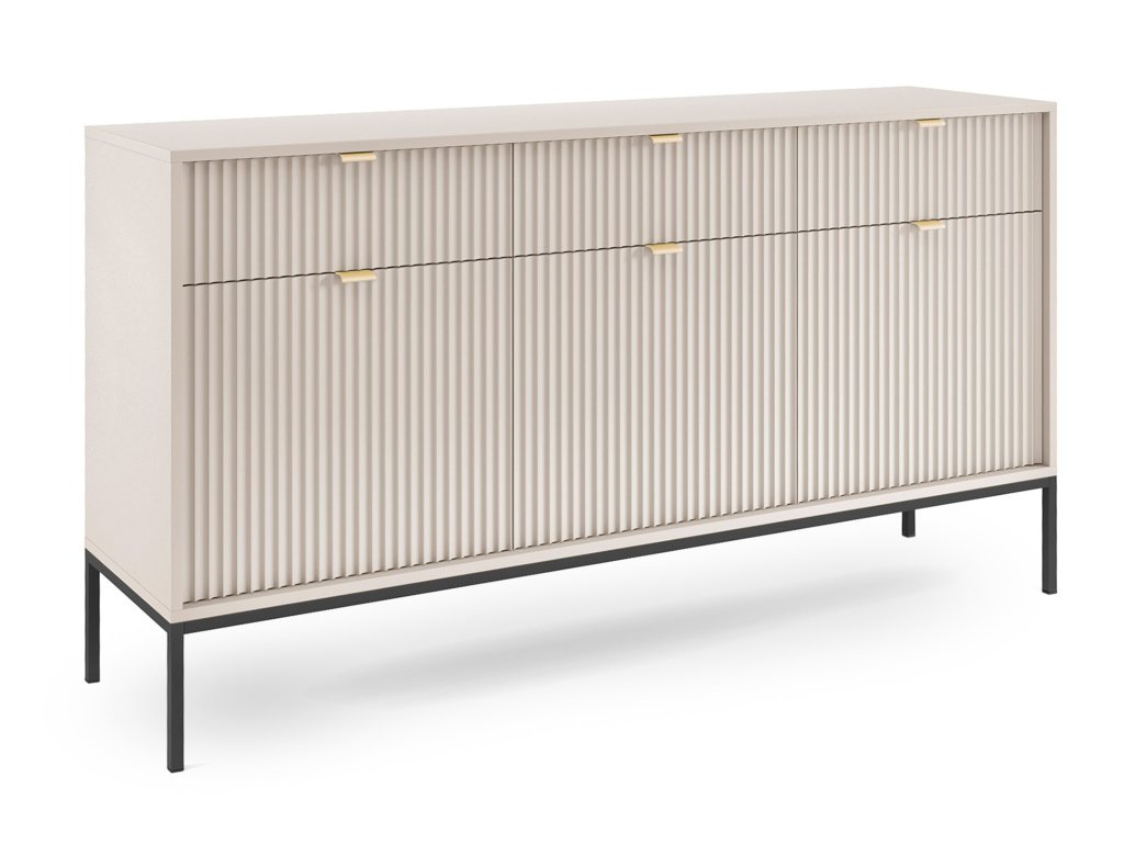 Komoda Nova KSZ154 v kašmírovom odtieni prinesie do vášho interiéru jemnú eleganciu a moderný nádych. Predné plochy zdobí zvislé frézovanie, ktoré vytvára zaujímavú štruktúru a dodáva komode prémiový vzhľad. Vizuálny efekt krásne podčiarkujú zlaté brúsené úchytky, ktoré pôsobia sofistikovane a štýlovo. Komoda stojí na čiernych, vysokých kovových nožičkách. Korpus je vyrobený z laminovanej DTD dosky, zatiaľ čo reliéfne čelá z MDF, čo zaručuje stabilitu, pevnosť a dlhú životnosť pri každodennom používaní.