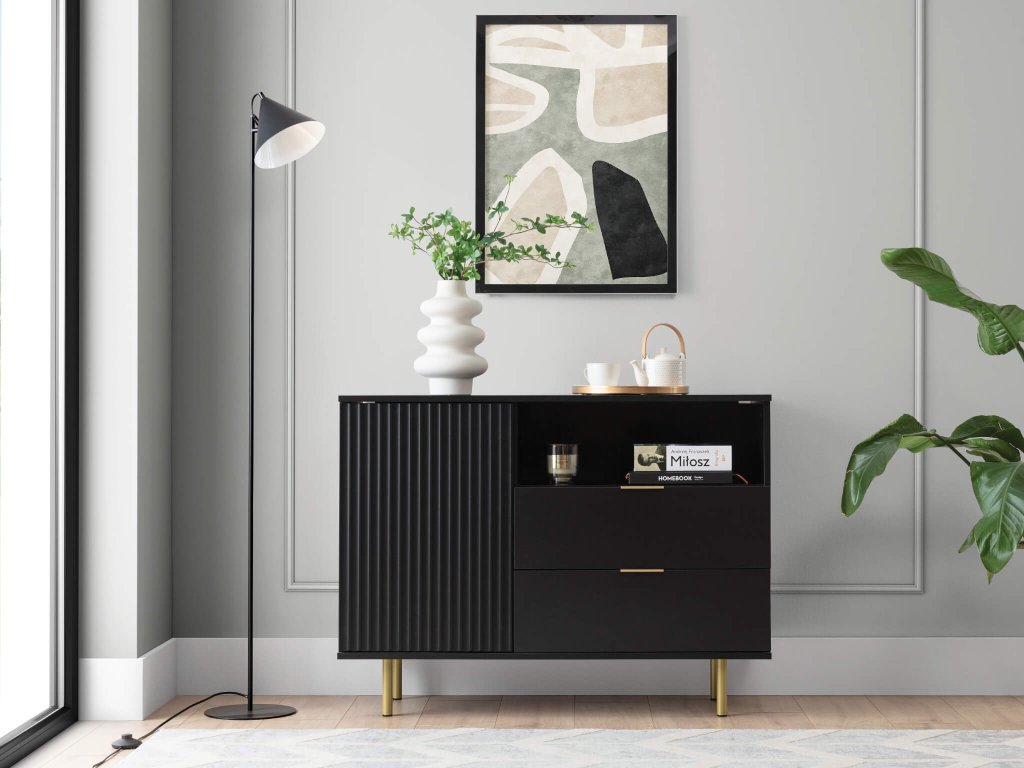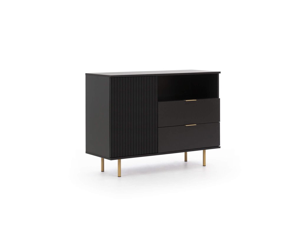 Objavte pôvab kolekcie NUBIA s nábytkovým kúskom - komodou NUBIA NB-01. S vysokými zlatými nožičkami dodáva každému kusu nábytku eleganciu a nádych luxusu. Vyrobená z kvalitnej drevotriesky s hrúbkou 16 mm a s ABS hranami pre vyššiu odolnosť. Úložný priestor komody zahŕňa police, dve priestranné zásuvky a skrinku rozdelenú na dve časti. S kovovými úchytmi a nožičkami v zlatej farbe, pôsobí luxusne, pričom 3D efekt na prednej časti komody dodáva vkusný dizajn. Systém push-to-open zabezpečuje pohodlné otváranie dverí. Ideálna do obývačky, chodby alebo pracovne.