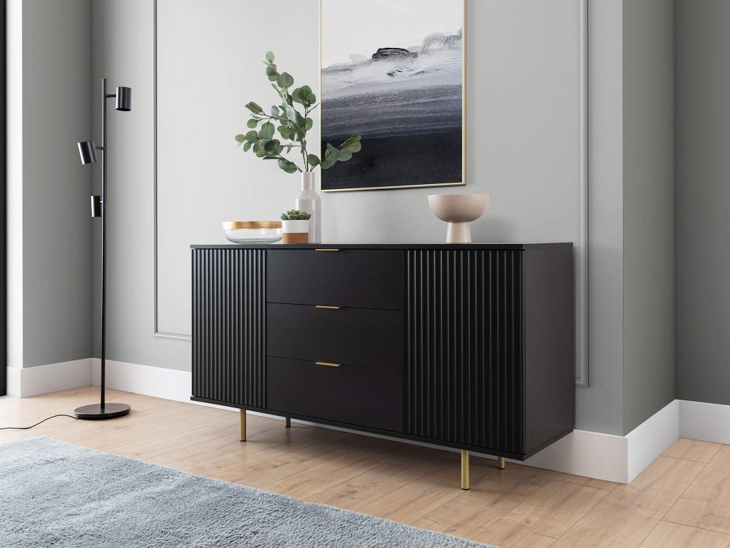 Nezameniteľná komoda NUBIA NB-02 zaujme každého, kto ocení moderný a elegantný dizajn v interiéri. Elegancia ozdobných drážok na predných častiach nábytku sa dokonale spája s brúsenými zlatými kovovými úchytmi. Ľahkosť nábytku zabezpečuje kovová konštrukcia s vysokými nožičkami. Kolekcia NUBIA umožňuje vytvoriť modernú obývačku, pričom niektoré kúsky môžete využiť aj v predsieni, jedálni alebo spálni. Korpus nábytku je vyrobený z laminovanej dosky, zatiaľ čo drážkované časti nábytku sú z kvalitnej MDF dosky.