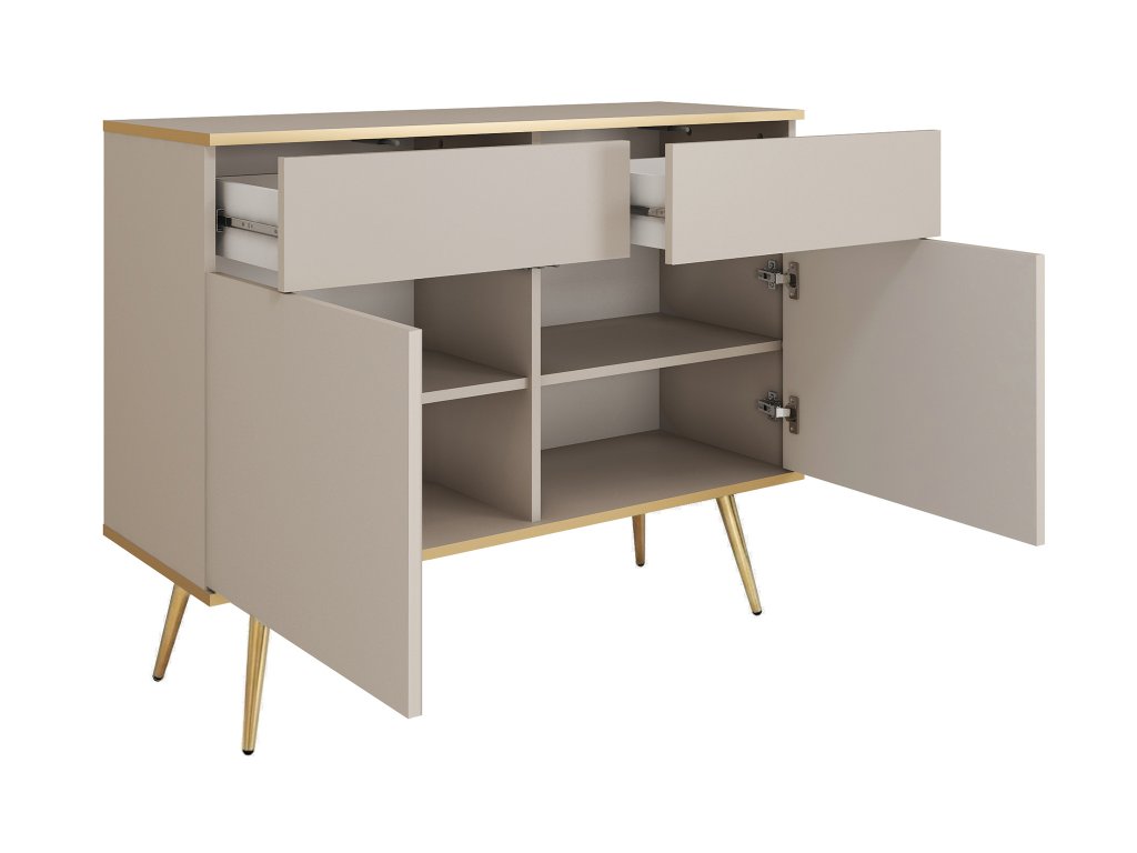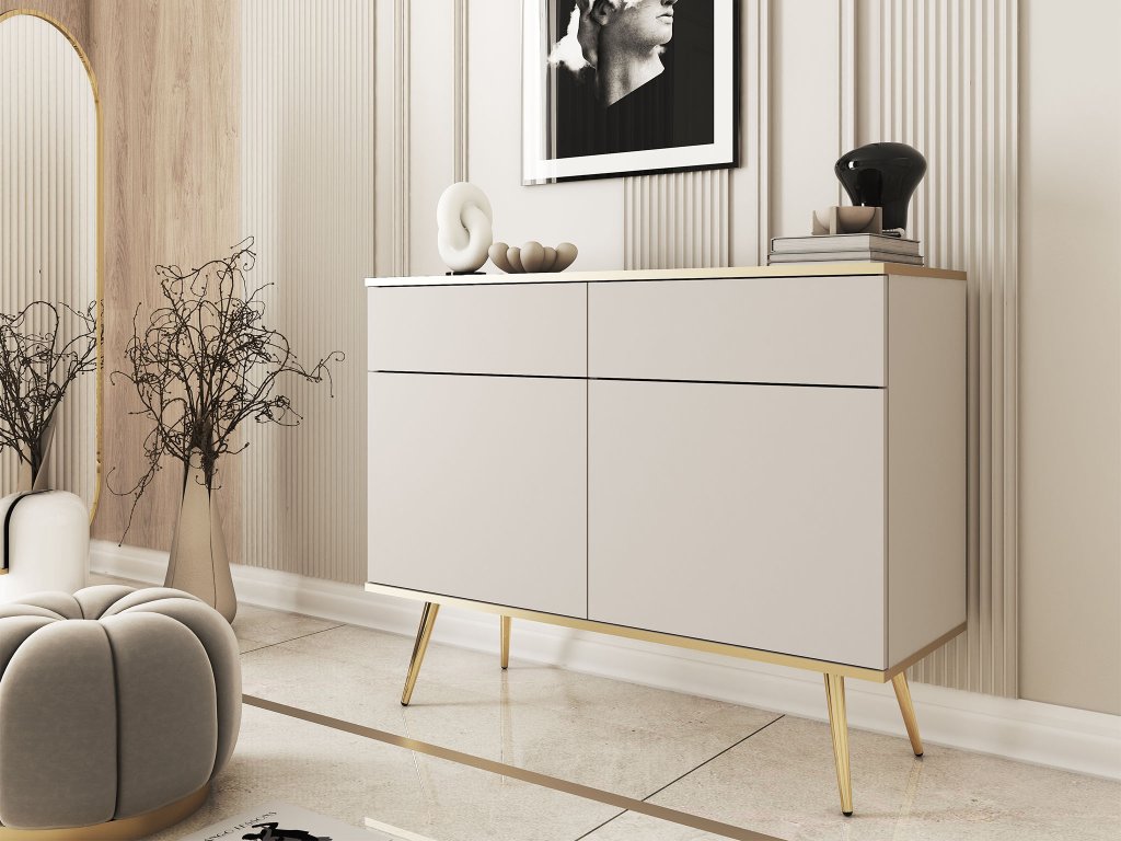 Komoda ORIQUE v elegantnom kašmírovom odtieni vnesie do vášho interiéru pocit jemnej noblesy, poriadku a nadčasového luxusu. Moderná silueta doplnená o zlaté detaily vytvára štýlový kontrast, ktorý pôsobí ľahko a vzdušne, no zároveň stabilne a prakticky. Hladké plochy spolu so zlatými kovovými nohami a jemnými líniami robia z komody nielen funkčný úložný priestor, ale aj výrazný dizajnový prvok, ktorý sa hodí do spální, obývačiek či chodieb v moderných, glamour aj minimalistických interiéroch.