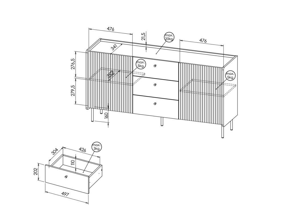 - Materiál: laminovaná doska / čierna drážkovaná MDF / plastové úchytky / kov