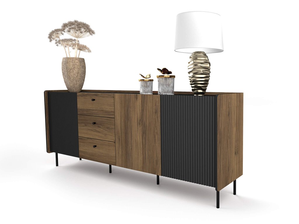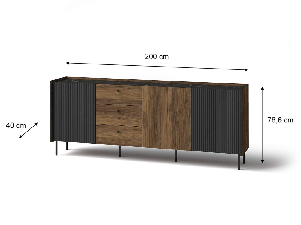 - Materiál: laminovaná doska / čierna drážkovaná MDF / plastové úchytky / kov
