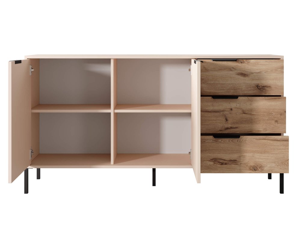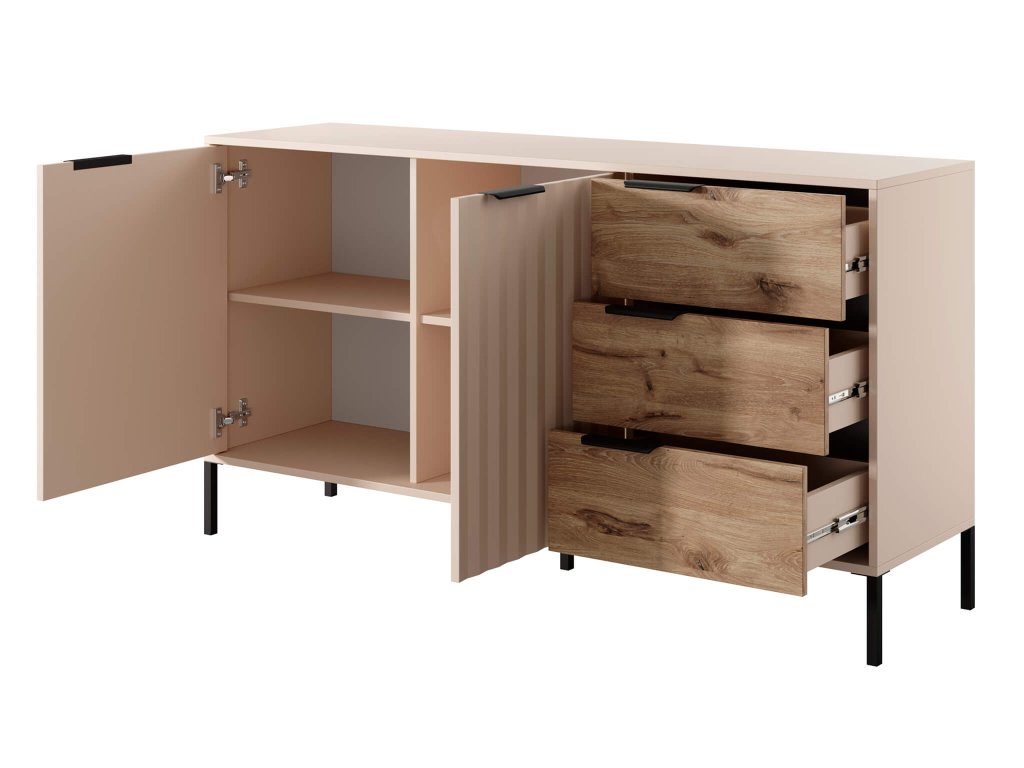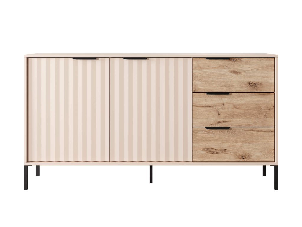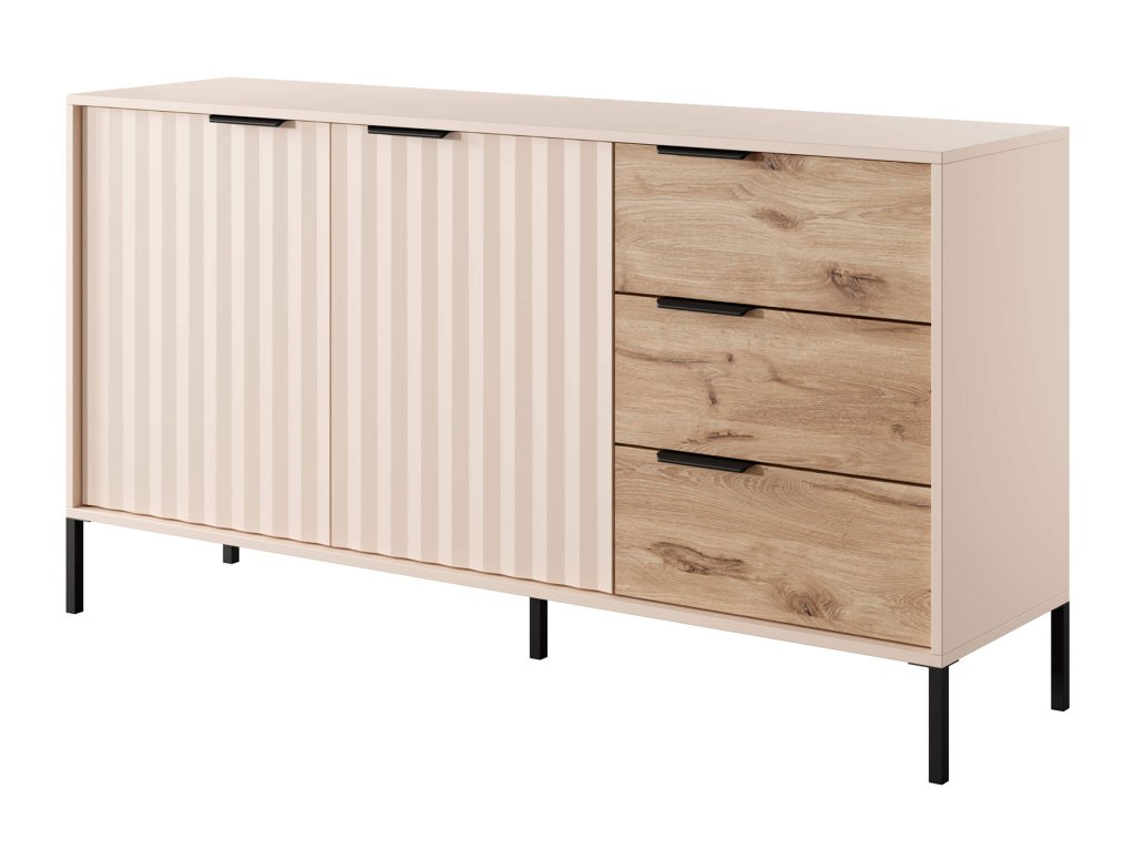 Komoda Rave je moderný a exkluzívny kus nábytku, ktorý bude perfektným doplnkom vášho interiéru. Vyrobená z laminovanej dosky s ABS hranami, je odolná a ľahko sa udržiava. Komoda je k dispozícii vo výnimočnej farebnej kombinácii - dub viking a béžová. Komoda Rave disponuje dvomi skrinkami s béžovými dvierkami z drážkovanej MDF dosky, ktoré dokonale doladia celkový vzhľad. Tri zásuvky pod sebou na pravej strane poskytujú dostatok úložného priestoru pre drobné veci, ktoré chcete udržať usporiadané a po ruke. Asymetricky umiestnené úchytky v čiernej matnej farbe sú netradičným prvkom, ktorý dodáva komode osobitý vzhľad. Komoda Rave stojí na kovových nohách, ktoré dodávajú stabilnosť a eleganciu. Je to kus nábytku, ktorý sa hodia do každého moderného interiéru a poskytne vám dostatok úložného priestoru pre vaše veci.