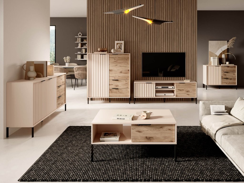 Obývačková kolekcia Rave je moderným a elegantným doplnkom pre vaše obývacie priestory. Vyrobená je z kvalitnej laminovanej dosky v kombinácii farieb dub Viking a béžová, ktorá vytvára pôsobivý vizuálny efekt. Drážkované MDF čelá v béžovej farbe a matné čierne asymetricky umiestnené úchytky dodávajú kolekcii štýlový a súčasný vzhľad. Kovové nohy zaisťujú stabilnú podporu a prirodzený vzhľad. Kolekcia Rave ponúka viacero typov nábytku, ktoré umožňujú flexibilitu a prispôsobenie sa vašim potrebám a predstavám. Zahrnuté sú komody, TV stolíky a konferenčný stolík. Tento nábytok nie je len krásny a moderný, ale aj praktický a funkčný, vďaka svojim výkonným skladovacím priestorom. Svojou kvalitou a vzhľadom predstavuje kolekcia Rave dokonalú voľbu pre každé moderné obývacie priestory.