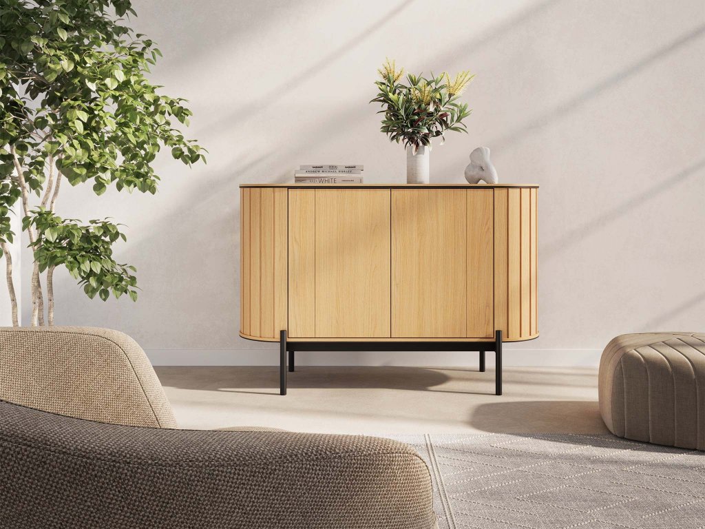 Komoda RT-02 z kolekcie Rotto je dokonalou kombináciou elegantného dizajnu a funkčnosti, vďaka čomu sa stane neoddeliteľnou súčasťou vašej obývačky, predsiene alebo spálne. Jej minimalistický vzhľad so sofistikovanými detailmi v dekore dubu zaujme na prvý pohľad. Komoda do obývačky ponúka dvojo dvierok so systémom push-to-open pre jednoduché a tiché otváranie, čím eliminuje potrebu rušivých úchytiek. Dve praktické police poskytujú dostatok priestoru na uschovanie vašich vecí, zatiaľ čo čierne kovové nožičky pridávajú moderný a vzdušný nádych. Okrem svojho atraktívneho vzhľadu sa táto komoda do chodby vyznačuje aj nenáročnou údržbou, takže si zachová svoj pôvab na dlhé roky.