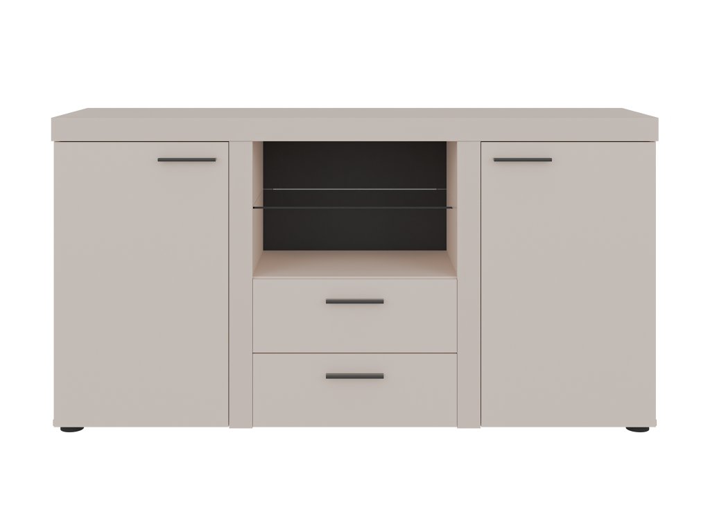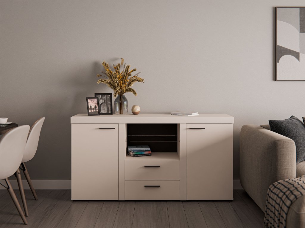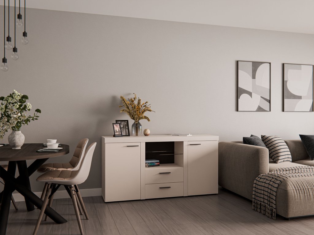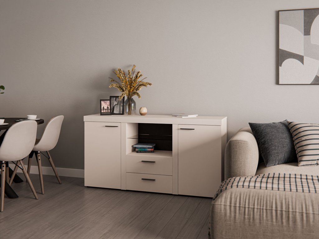Vnútorné usporiadanie komody je navrhnuté s dôrazom na maximálnu prehľadnosť a funkčnosť. Ponúka dve priestranné zásuvky a dve bočné skrinky, v ktorých nájdete tri police na uloženie vašich vecí. Výnimočným prvkom je polica z 5 mm priehľadného skla, ktorá je ideálna na vystavenie dekorácií a dodáva nábytku odľahčený, luxusný vzhľad. S celkovou šírkou 156,4 cm a hĺbkou 40,3 cm získate objemný úložný priestor, ktorý vďaka pieskovej farbe opticky nezaťaží miestnosť, ale naopak jej dodá štýlový šmrnc.
