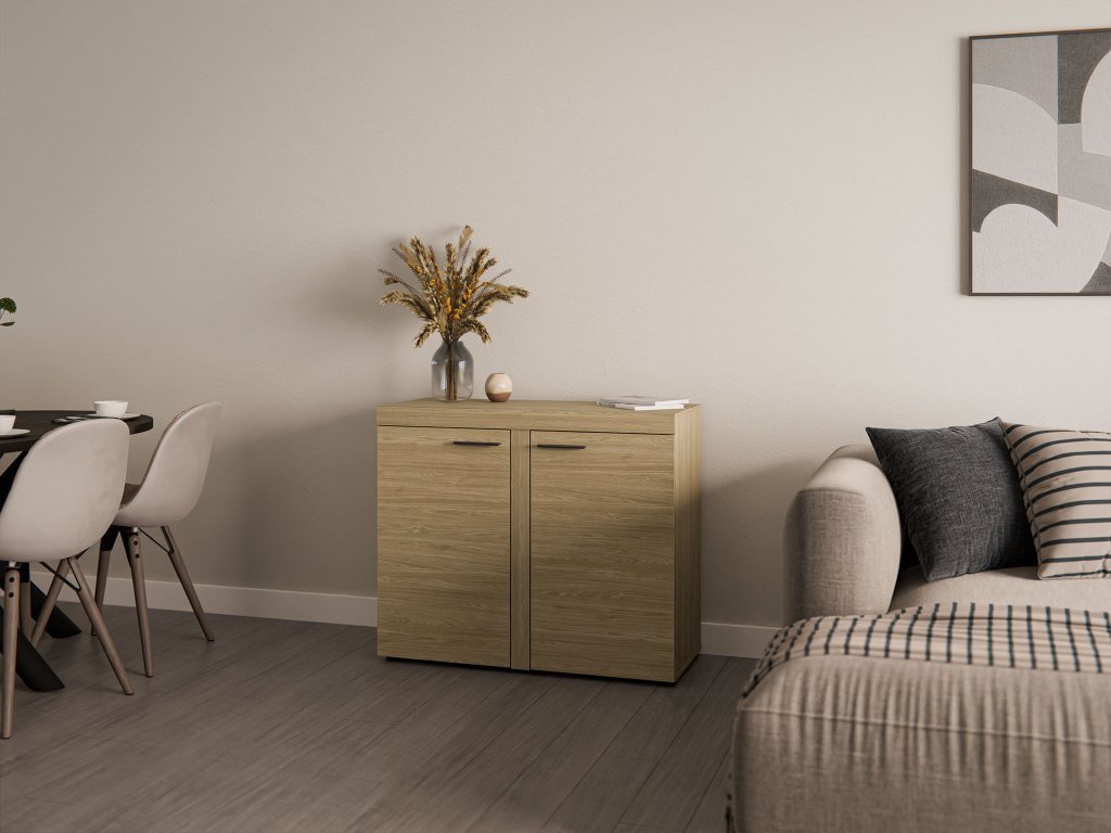 Táto dvojdverová komoda je navrhnutá tak, aby vám pomohla udržať v domácnosti dokonalý poriadok bez kompromisov v štýle. Za dvierkami sa ukrývajú dve priestranné police, ktoré hravo pojmu všetko od kníh až po bytové doplnky. Celé vnútro je vyhotovené v rovnakom dekore duba olejovaného, čo podčiarkuje prémiový charakter celého kusu nábytku. Vďaka svojej optimálnej veľkosti a funkčnému členeniu sa komoda Rumba 2F stane vaším obľúbeným organizačným pomocníkom, ktorý vďaka precíznemu spracovaniu hrán hravo zvládne aj každodennú záťaž.