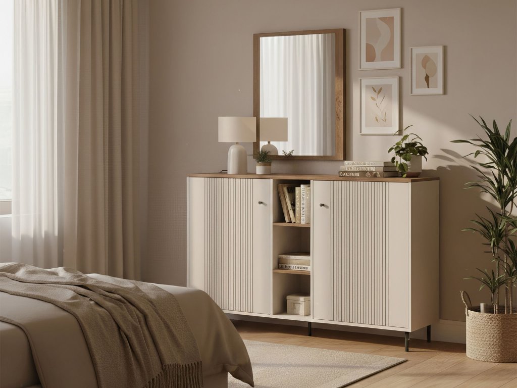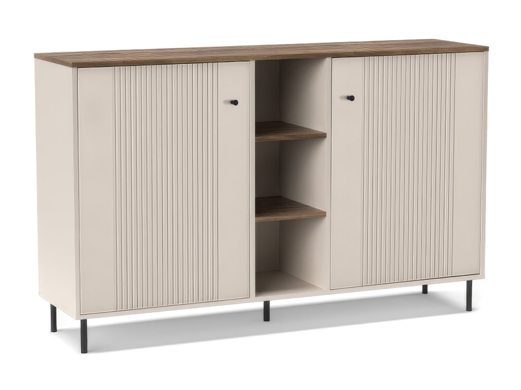 Moderná komoda TIRAMISU v sebe spája nadčasovú eleganciu a praktickú funkčnosť. Kombinácia jemného kašmírového odtieňa s prírodným dekorom vytvára harmonický a útulný vzhľad, ktorý sa prirodzene hodí do obývačky, predsiene aj iných obytných priestorov. Komoda je navrhnutá bez zásuviek – po stranách ponúka uzavretý úložný priestor s policami za dvierkami, ideálny na uschovanie vecí, ktoré chcete mať mimo dohľadu. V strednej časti sa nachádzajú otvorené police, ktoré sú perfektné na knihy, dekorácie alebo dizajnové doplnky a dodávajú nábytku ľahký, vzdušný charakter. Úložný priestor je navrhnutý s dôrazom na praktickosť – ponúka dostatok miesta na uloženie oblečenia, doplnkov či rôznych drobností. Jednoduché línie, čistý dizajn a premyslené proporcie robia z komody TIRAMISU nielen funkčný, ale aj výrazný dizajnový prvok, ktorý prirodzene zapadne do moderného aj útulného interiéru.