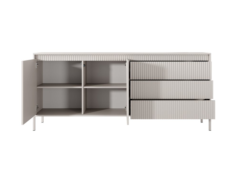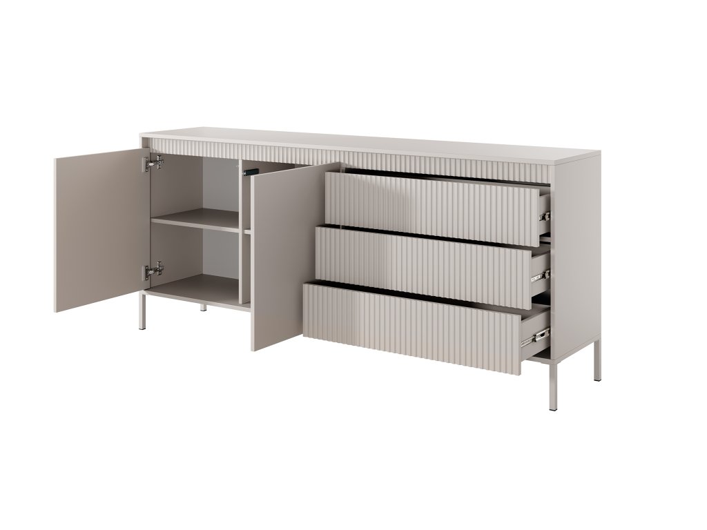 Svetlá priestranná komoda SENSO C 187 je súčasťou kolekcie SENSO. Komoda vám ponúka množstvo úložného priestoru, ktorý sa skladá z dvoch skriniek a troch širokých zásuviek. Zásuvky majú jemne 3D drážkovaný dizajn, ktorý ju oživí. Skrinky majú zabudovaný systém "push to open", ktorý určite oceníte. Vďaka nemu je komoda bez úchytov, čo zachováva jej dizajn a štruktúru. 3D vrúbkovaný efekt rozžiari celý kus nábytku. Komoda má päť praktických políc na uskladnenie vecí.