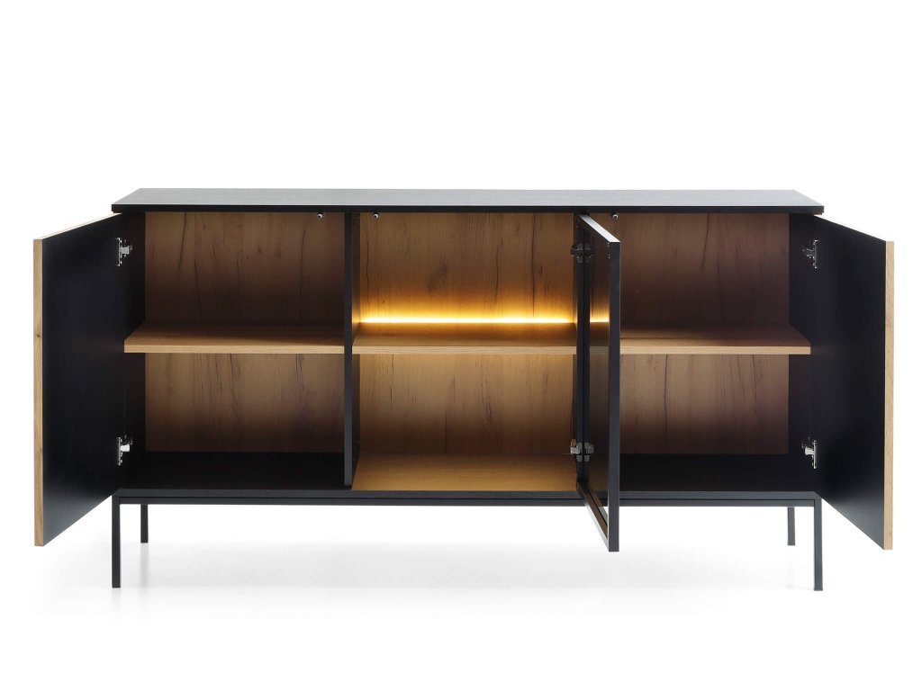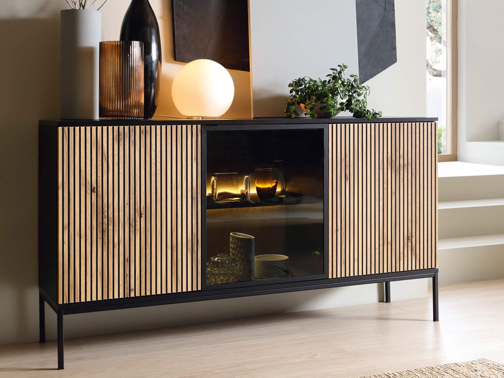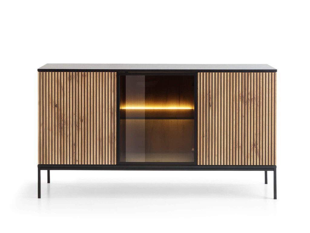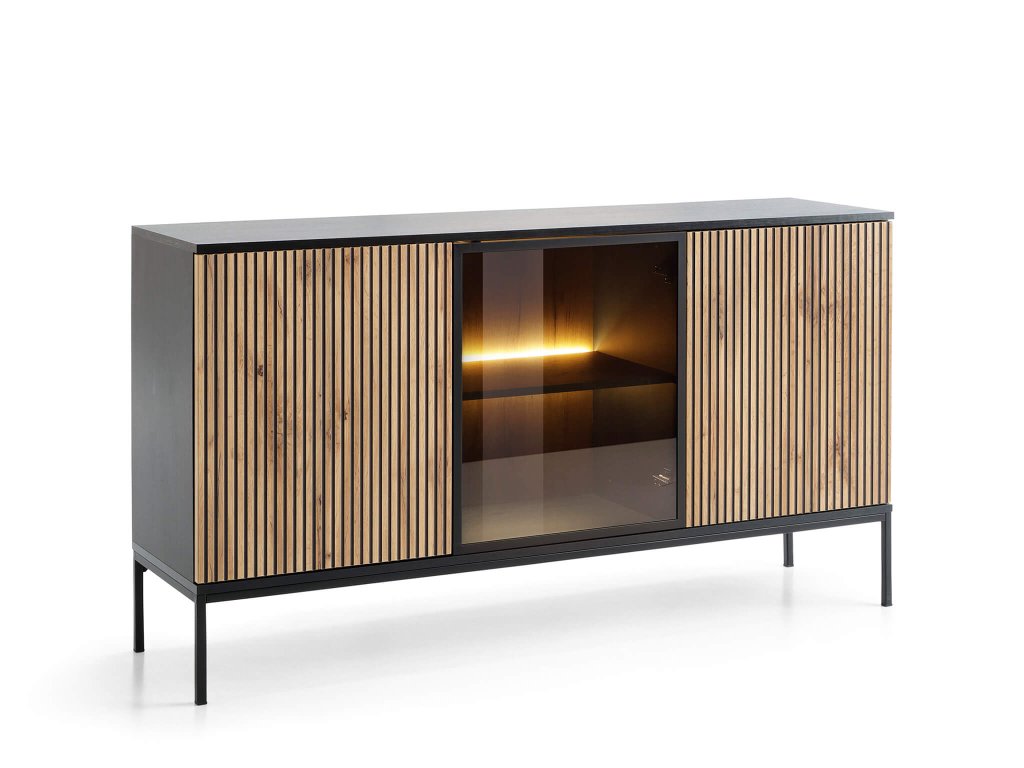 Priestranná trojdverová komoda SENTO s LED podsvietenou poličkou v strednej časti. Tento elegantný a moderný kus nábytku zaujme na prvý pohľad. Matná čierna pekne ladí s drážkovanými dvierkami v netradičnom odtieni dub wotan. Na elegancii komode pridávajú aj stredné dvierka, ktoré sú vyrobené z tvrdeného skla. Komoda má šírku 154 cm, vďaka čomu budete mať skutočne bohatý úložný priestor, šesť políc a priestrannú vrchnú dosku na dekorácie. Komoda je vyrobená z kvalitnej laminovanej dosky s odolnými ABS hranami.