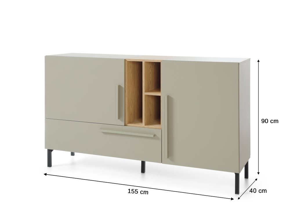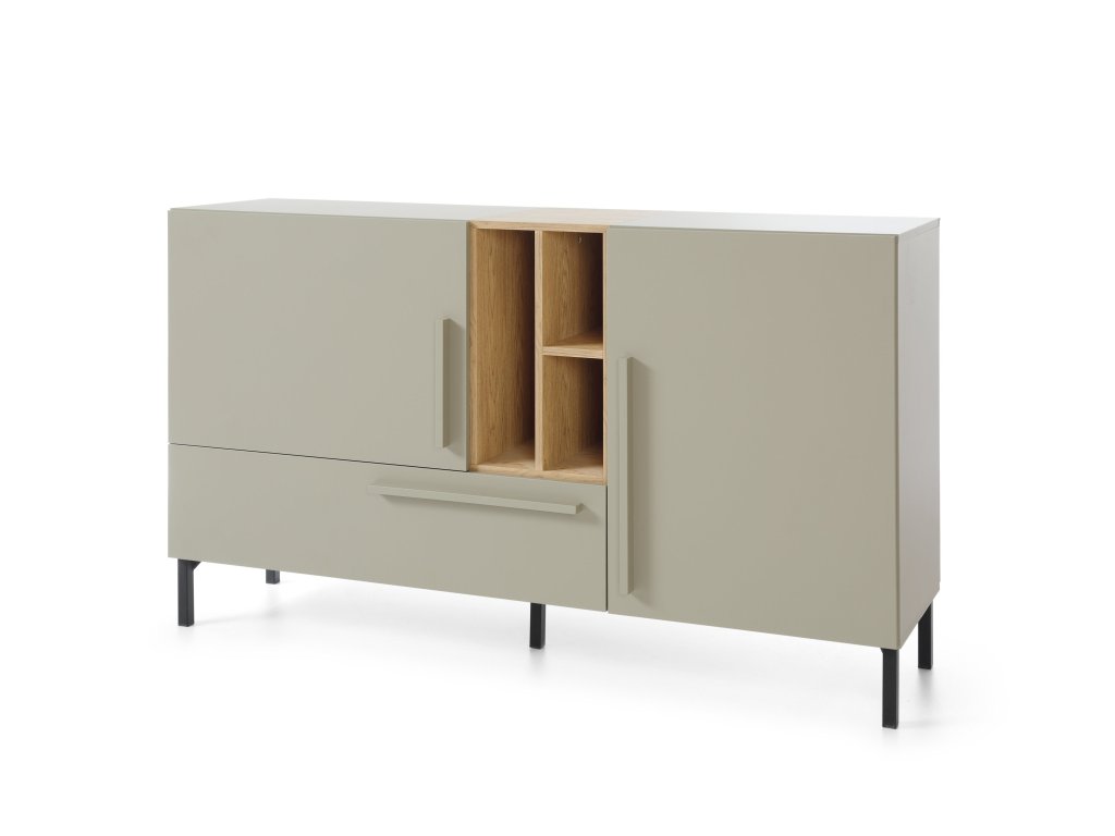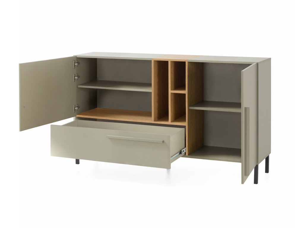 Priestranná dvojdverová komoda SERGIO S6 s dvomi dvierkami, zásuvkou a otvorenými poličkami vo farbe dub baltic. K dispozícii je aj vrchná doska na kvety a dekorácie. Dvierka aj zásuvka majú dlhú úchytku v zelenej farbe. Elegantná komoda je využiteľná v pracovni, spálni, predsieni či detskej izbe. Záleží len na vašich potrebách. Dvojdverová komoda so zásuvkou je vyrobená z kvalitnej laminovanej dosky s hrúbkou 16 mm. Hrany sú zakončené odolnou ABS dyhou. Vysoké čierne nožičky sú vyrobené z kovu.