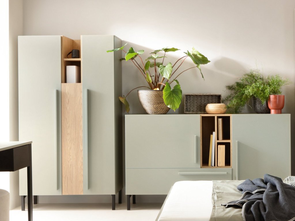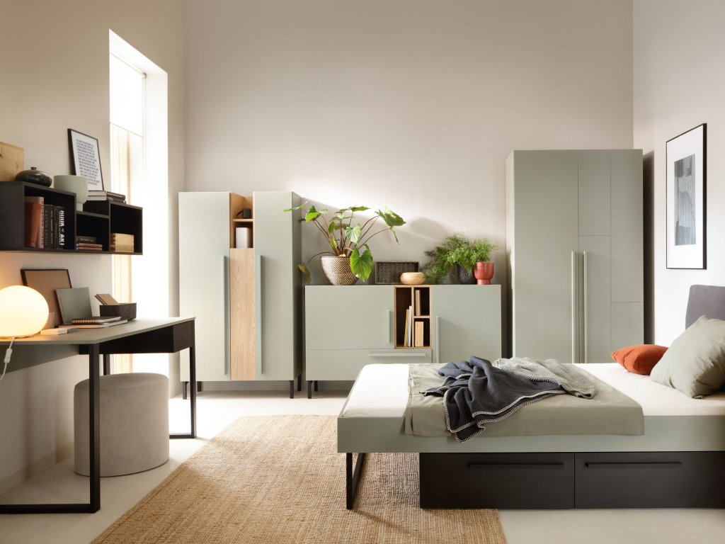 Trendy nábytková zostava SERGIO v prírodných farbách je vhodná pre študentov, mladých pracujúcich, do domácich pracovní alebo aj do nadčasových detských izieb. Celá kolekcia je vyrobená v zelenom odtieni eukalyptus, ktorý vytvára veľmi príjemné prostredie. Komody aj šatníkové skrine SERGIO majú vysoké čierne nožičky, takže pod nimi ľahko povysávate a udržíte si poriadok. Zelená farba je skombinovaná s dreveným odtieňom dub baltic dune a antracitovou farbou.