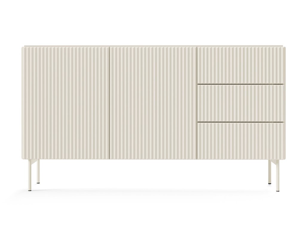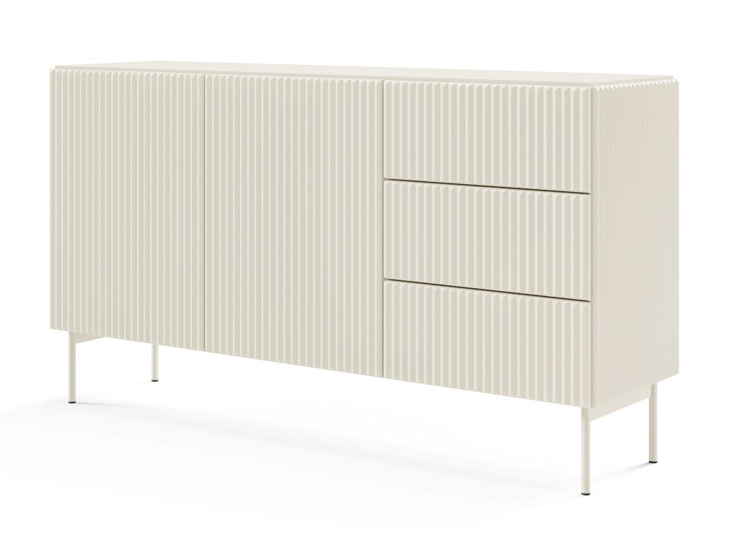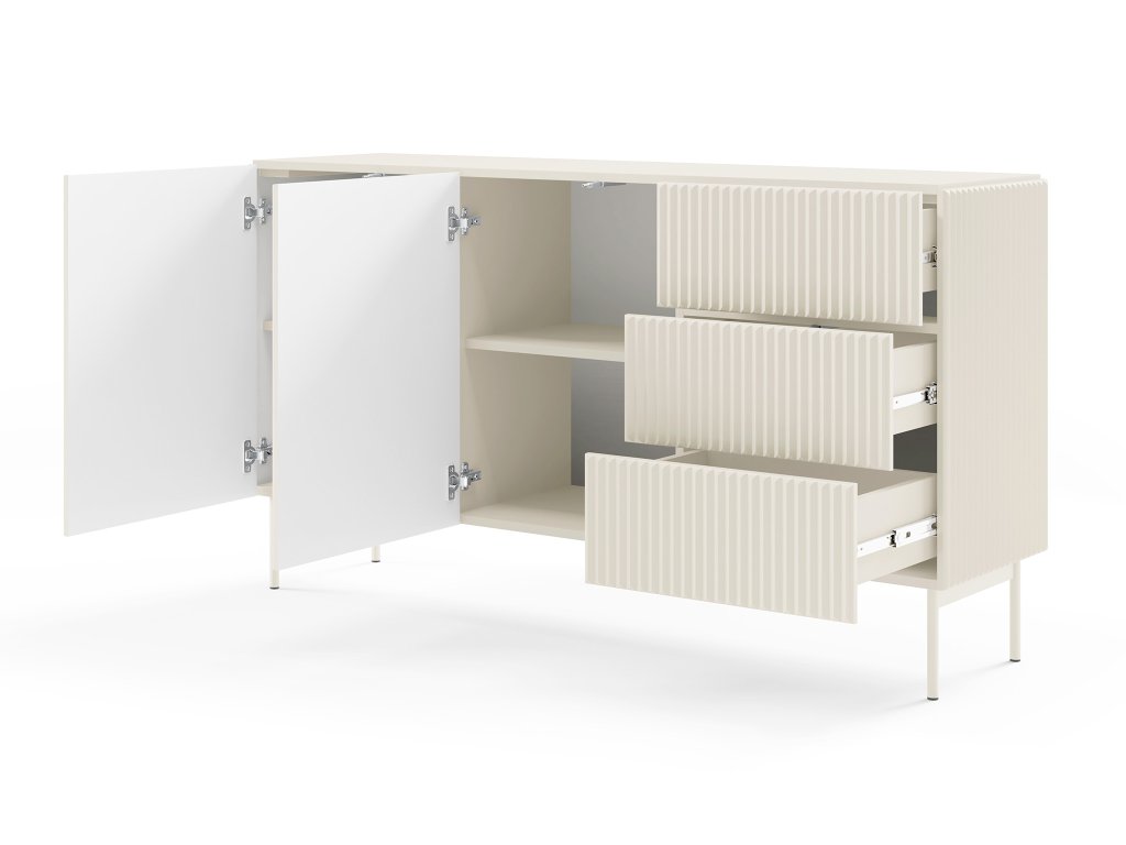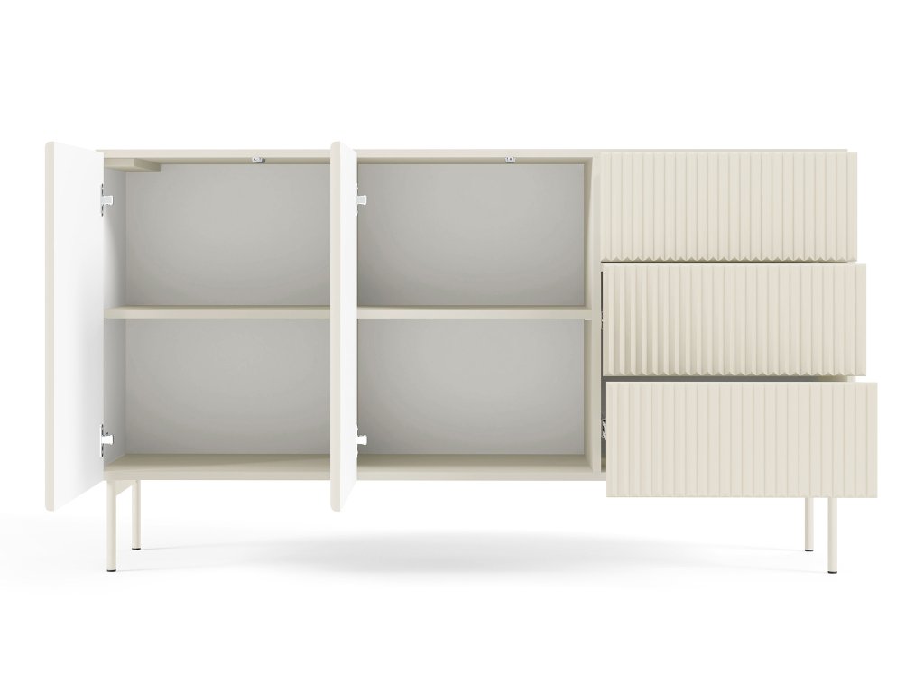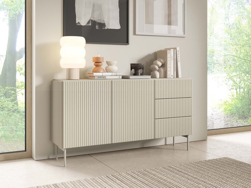 Komoda Muti D upúta harmonickým, súčasným dizajnom, ktorý zvýrazňujú jemné drážkované čelá a precízne spracované línie. Kašmírové prevedenie pôsobí teplo, luxusne a ľahko zapadne do minimalistických aj útulných interiérov. Na ľavej strane sa nachádzajú dvoje dvierka s vnútornými policami, ktoré poskytujú priestor pre prehľadné uskladnenie väčších predmetov a doplnkov. Muti D je skvelou voľbou pre domácnosti, ktoré hľadajú štýlový, funkčný a priestorovo úsporný kus nábytku, ktorý ľahko vynikne v spálni, obývačke či chodbe.