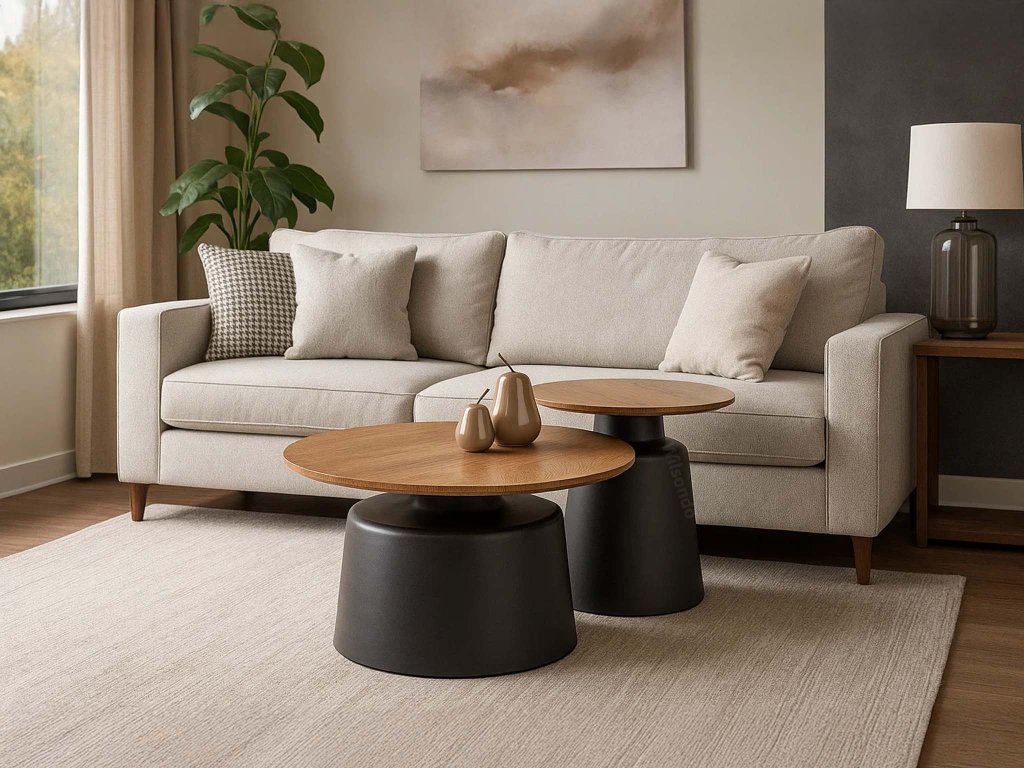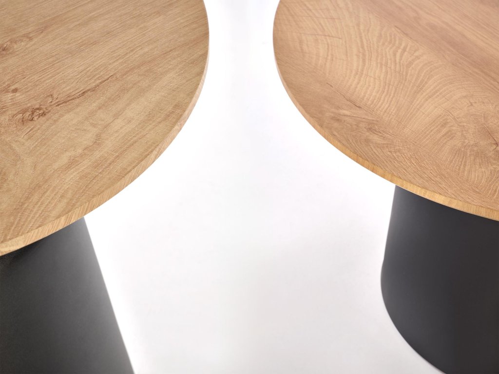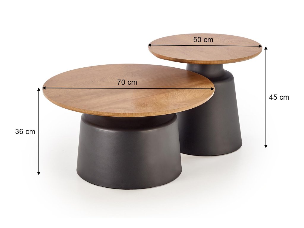 Súprava Malomi predstavuje spojenie elegancie, funkčnosti a nadčasového štýlu. Dva okrúhle stolíky s priemerom 70 cm a 50 cm možno použiť samostatne, vedľa seba alebo sčasti zasunúť jeden pod druhý, čím ušetríte miesto v menších interiéroch. Vrchné dosky z dyhovanej MDF v prírodnom odtieni krásne kontrastujú s čiernou oceľovou podnožou, čo vytvára moderný a útulný vzhľad vhodný do škandinávskych, loftových aj minimalistických priestorov.