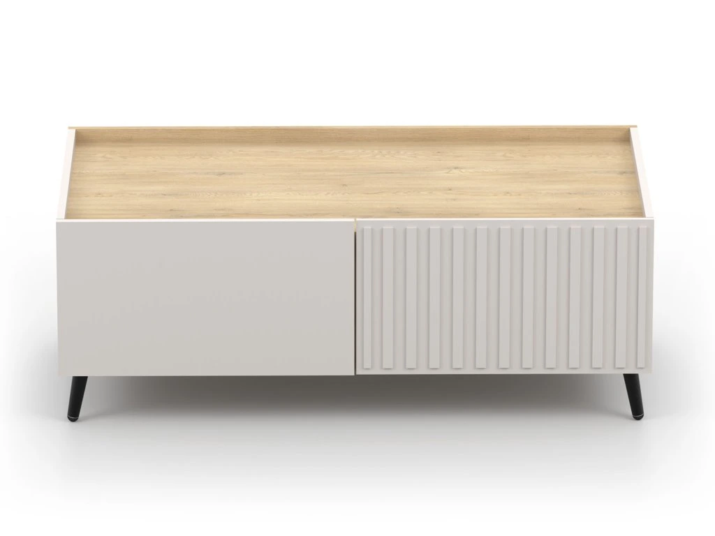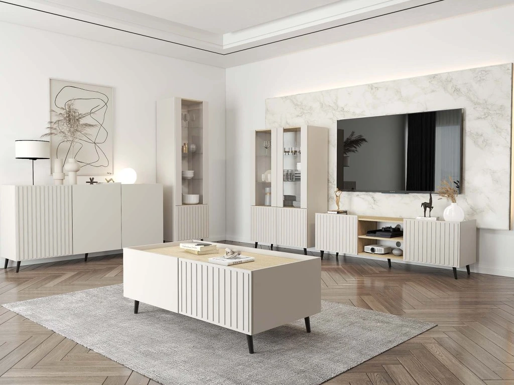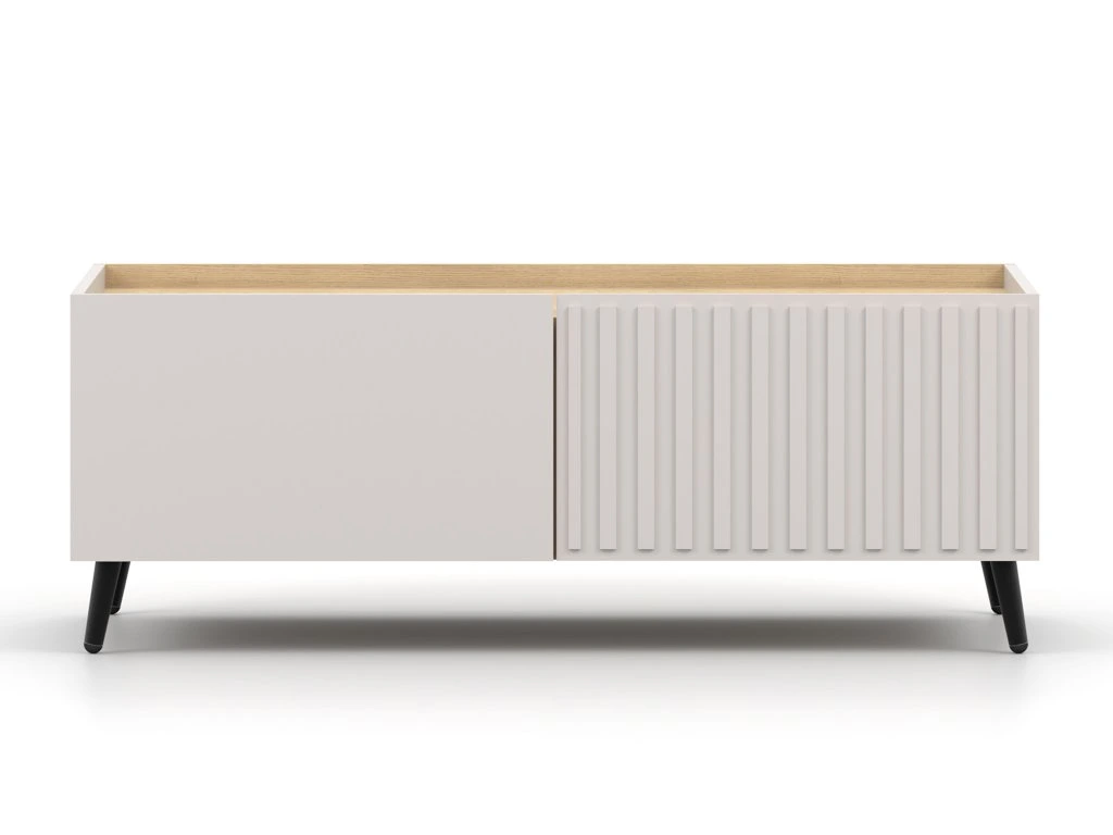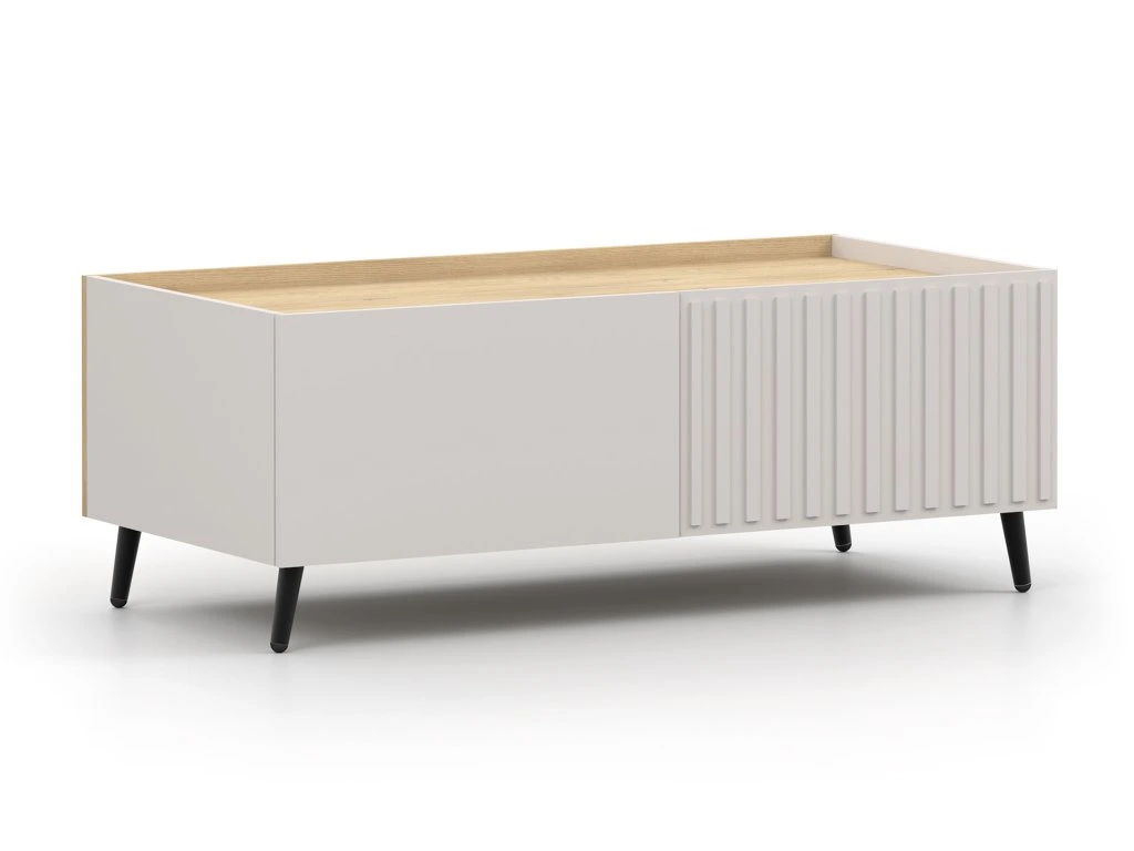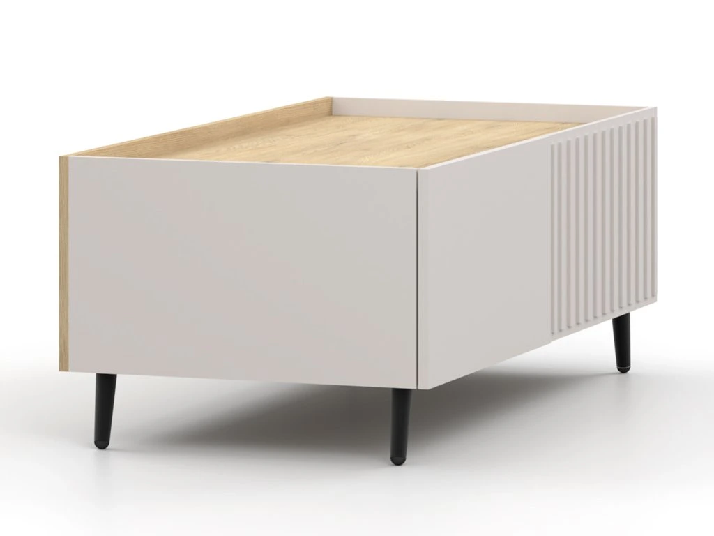 Elegantný konferenčný stolík Goja v odtieni kašmírovej farby pôsobí moderne, no zároveň útulne. Jemný povrch dopĺňajú vložené prvky v dekore dub Cremona, ktoré vnášajú do interiéru prirodzené teplo. Stolík je vybavený dvoma praktickými skrinkami s výklopnými čelami, kam pohodlne uložíte všetko, čo chcete mať po ruke. Bezúchytkový systém podčiarkuje minimalistický vzhľad a kovové nohy v čiernom prevedení mu dodávajú vzdušnosť i stabilitu. Tento model je ideálnym doplnkom do moderných aj klasicky ladených obývačiek, kde vynikne svojou decentnou eleganciou.