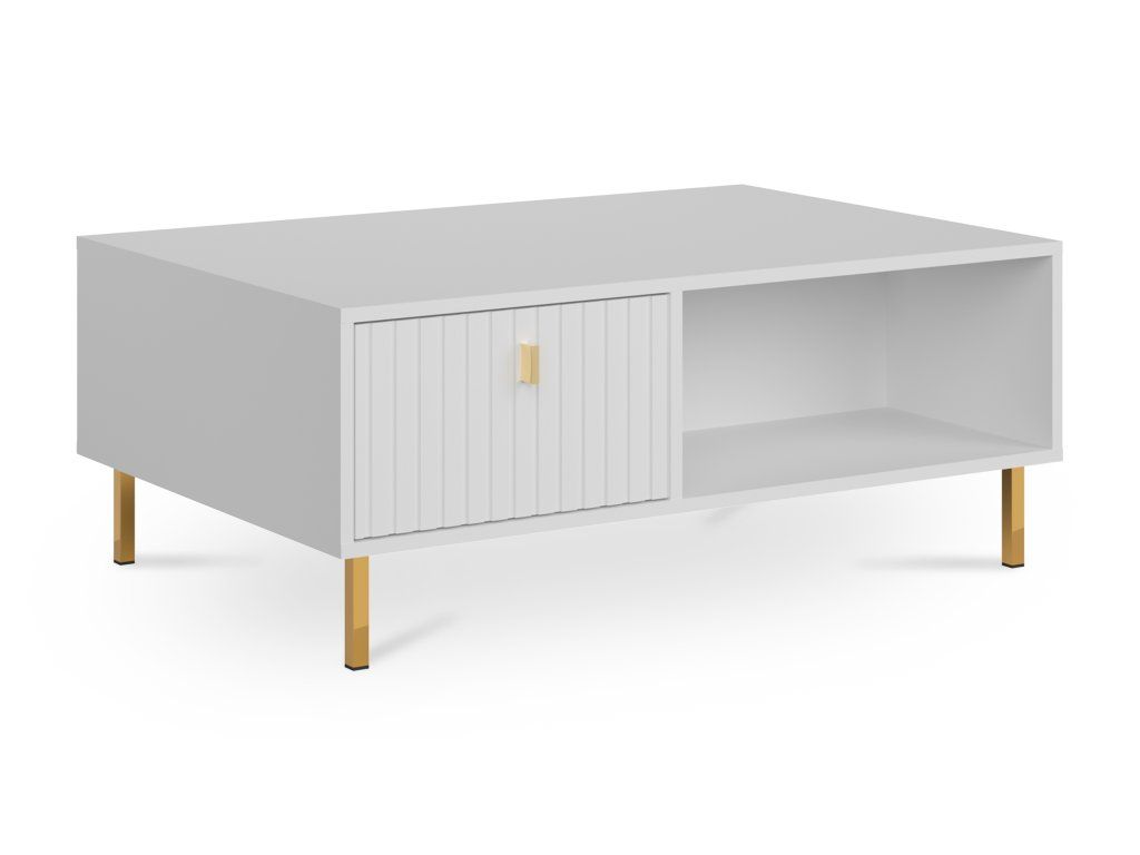 Hľadáte kúsok, ktorý do vašej obývacej izby vnesie vizuálnu čistotu a moderný šmrnc? Tento konferenčný stolík v žiarivom bielom prevedení je navrhnutý tak, aby rozjasnil priestor pri vašej pohovke. Ponúka inteligentne riešený odkladací priestor – jednu zásuvku s dekoratívnym frézovaním pre skryté uloženie drobností a priestrannú otvorenú policu, kde nájdu svoje miesto knihy či ovládače. Subtílne zlaté nožičky zdvíhajú stolík do ideálnej výšky, čo oceníte nielen pri podávaní kávy, ale aj pri pohľade na vzdušný a nezaťažený interiér.
