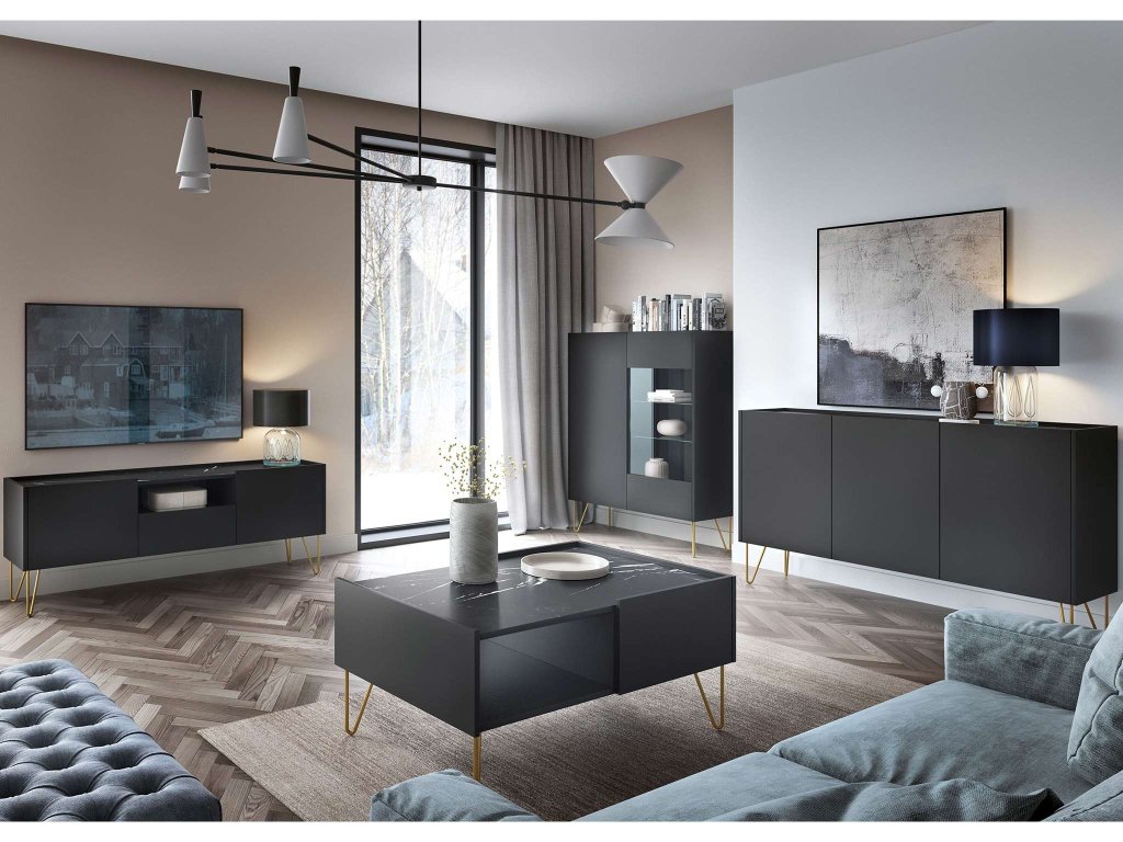 Kolekcia HARMONY pozostáva z elegantných kusov nábytku vhodných do modernej obývacej izby. Výrazná farba čierneho grafitu v kombinácii so zlatými kovovými nožičkami a vrchnou doskou s imitáciou čierneho mramoru pôsobí luxusne a dizajnovo. Na výrobu nábytku bola použitá kvalitná laminovaná doska s odolnými ABS hranami a kov. Každý kus z kolekcie má 20 cm vysoké kovové nožičky v zlatej farbe, vďaka ktorým je nábytok v ideálnej výške od zeme a miestnosť pôsobí vzdušne.