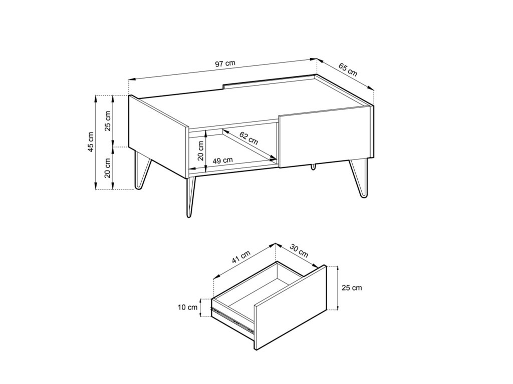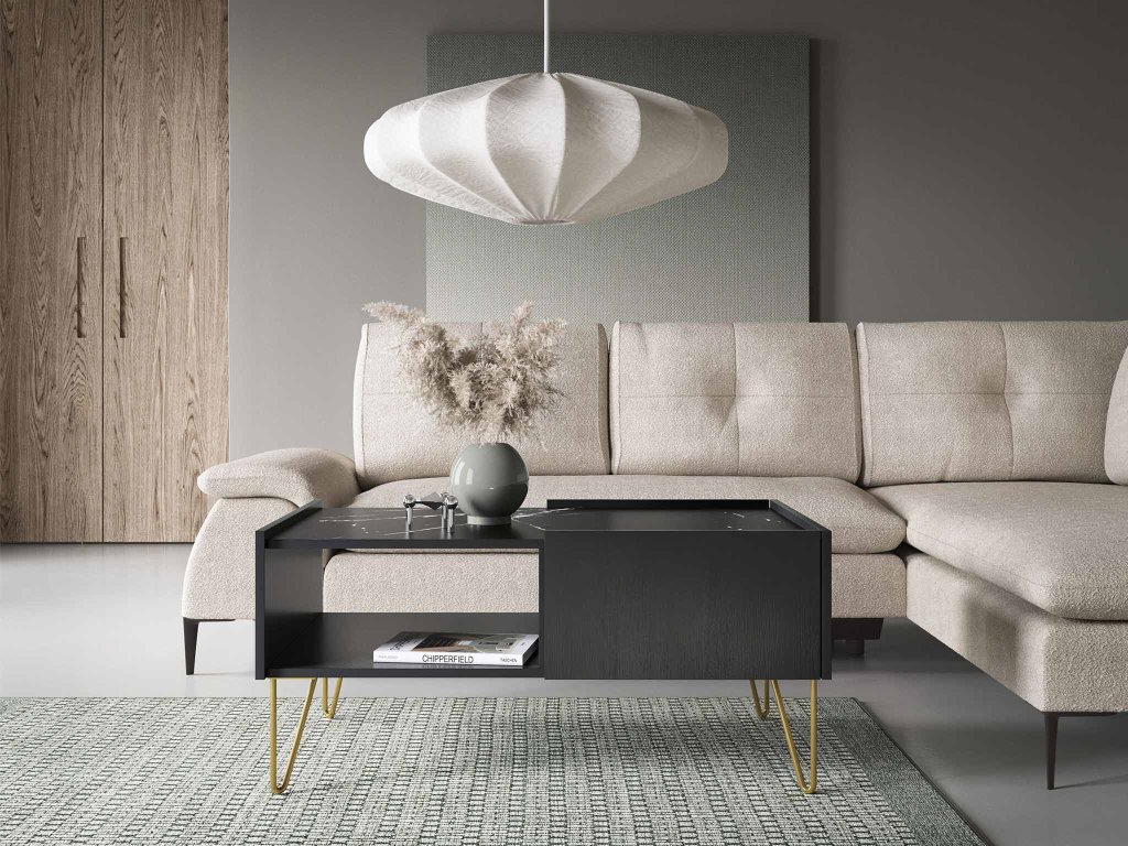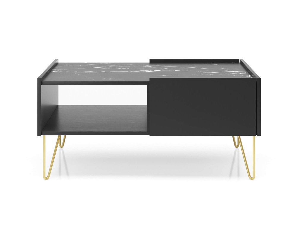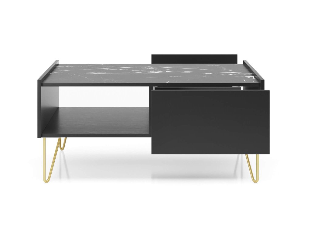 Konferenčný stolík Harmony L97 s priestrannou vrchnou doskou s imitáciou čierneho mramoru. Stolík má otvorený úložný priestor a k tomu ešte dve zásuvky s funkciou otvárania push-to-open, do ktorých si viete pekne naukladať všetky ovládače a iné drobnosti.