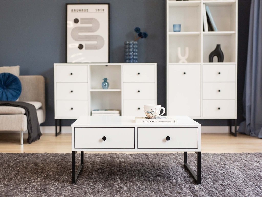 Biely konferenčný stolík Linea je vyrobený z kvalitnej laminátovej dosky s hrúbkou 16 mm, ktorá je doplnená o odolné ABS hrany. Konferenčný stolík do obývačky ponúka dve praktické zásuvky, ideálne na uloženie časopisov, ovládačov a iných drobností. Stabilitu a moderný vzhľad zabezpečujú kovové nohy s čiernym práškovým nástrekom. Vďaka svojej neutrálnej bielej farbe sa konferenčný stolík Linea ľahko prispôsobí akémukoľvek interiéru a dodá mu štýlový nádych.
