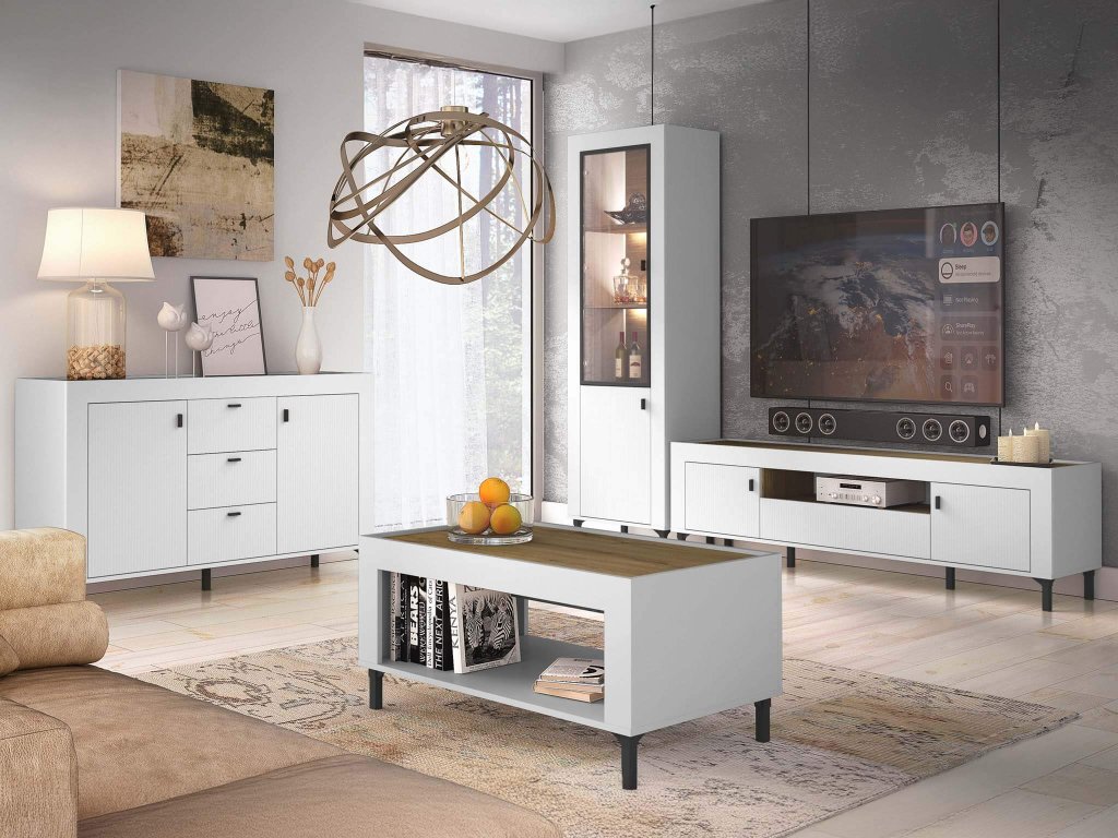 Konferenčný stolík Mossa je štýlový a praktický doplnok do vašej obývačky. Jeho moderný dizajn v kombinácii bielej farby a dubu whisky vytvára harmonický kontrast, ktorý sa hodí do každého interiéru. Horná doska stolíka je vo farbe dubu whisky a je prakticky ohraničená, čím zabezpečuje, že drobnosti ako diaľkové ovládače, poháre či dekorácie z nej len tak ľahko neskĺznu. V strede stolíka sa nachádza štýlový výrez, ktorý slúži ako úložný priestor pre časopisy, knihy alebo ďalšie potrebné veci, ktoré chcete mať po ruke.