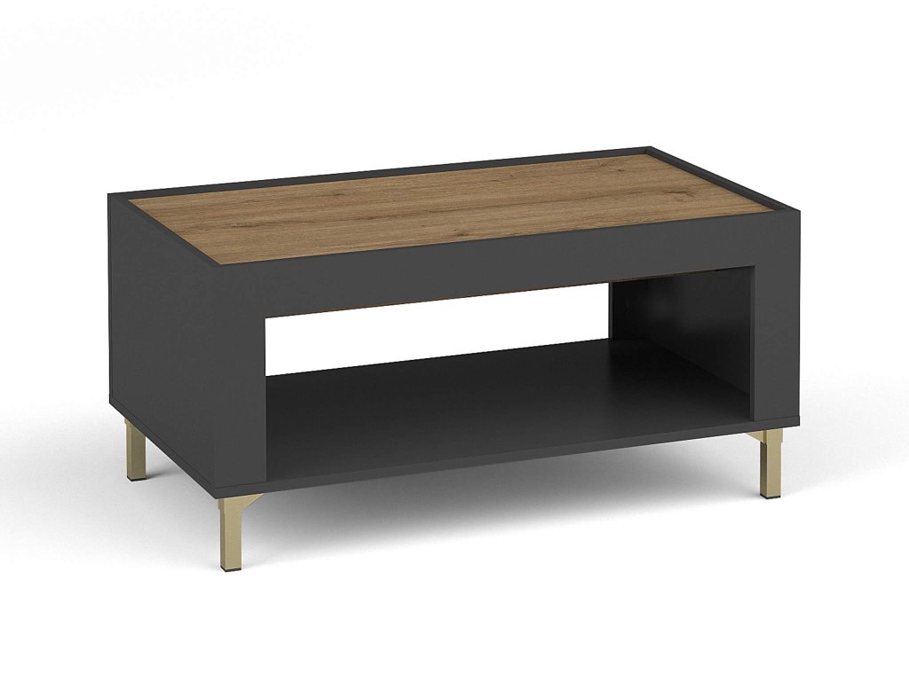 Konferenčný stolík Mossa je moderným a vkusným riešením pre každý obývací priestor. Jeho dizajn v trendovej kombinácii čiernej farby a dubu whisky prinesie do interiéru jemný kontrast a štýl. Stolík disponuje praktickou hornou doskou v dekore dubu whisky, ktorá je ohraničená pre vyššiu bezpečnosť vašich vecí – zabraňuje nežiadanému skĺznutiu predmetov, ako sú diaľkové ovládače, poháre či dekorácie. Jedinečnou črtou tohto stolíka je stredový výrez, ktorý slúži ako úložný priestor pre knihy, časopisy či iné doplnky. Stolík pevne stojí na štyroch vysokých nožičkách, ktoré zabezpečujú stabilitu a zároveň uľahčujú upratovanie pod stolíkom.