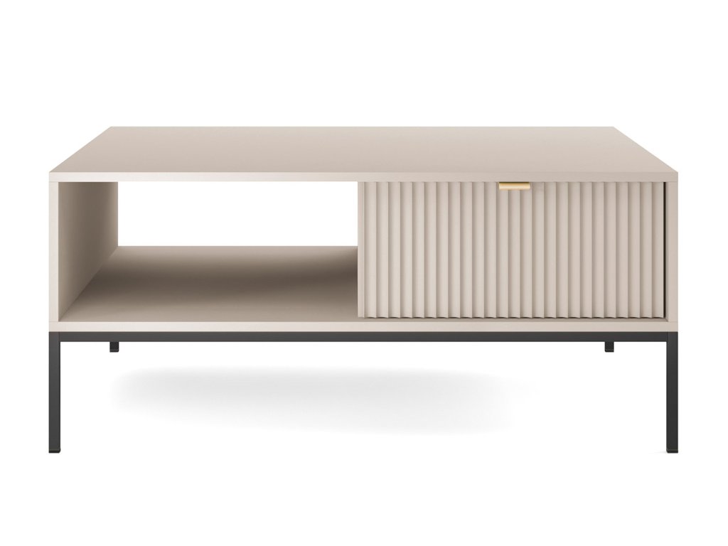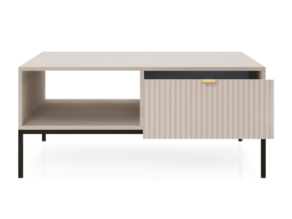 Stolík Nova L104 v kašmírovom odtieni prináša do vášho interiéru jemný, moderný a nadčasový štýl. Elegantné drážkované čelá vytvárajú zaujímavú textúru, ktorá upúta pozornosť, a celý vzhľad stolíka dopĺňajú jemne brúsené zlaté úchytky. Vysoké čierne kovové nožičky dodávajú stolíku ľahkosť a moderný charakter, takže sa stane nielen praktickým, ale aj vizuálne atraktívnym doplnkom obývacej izby.