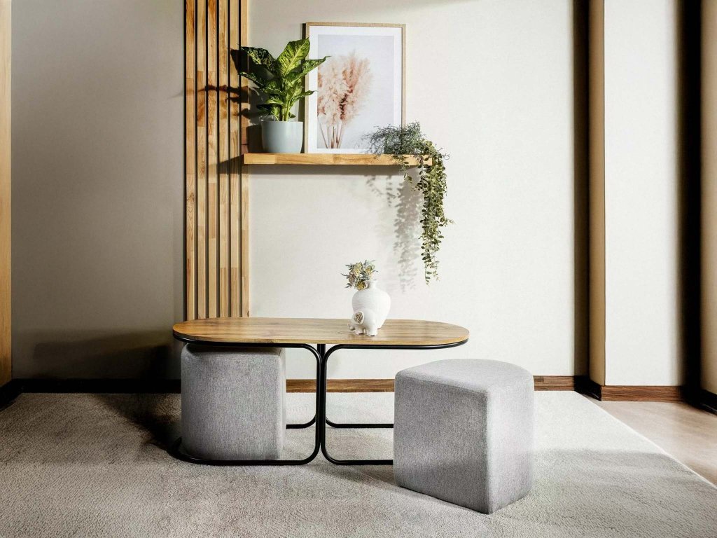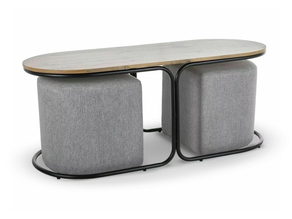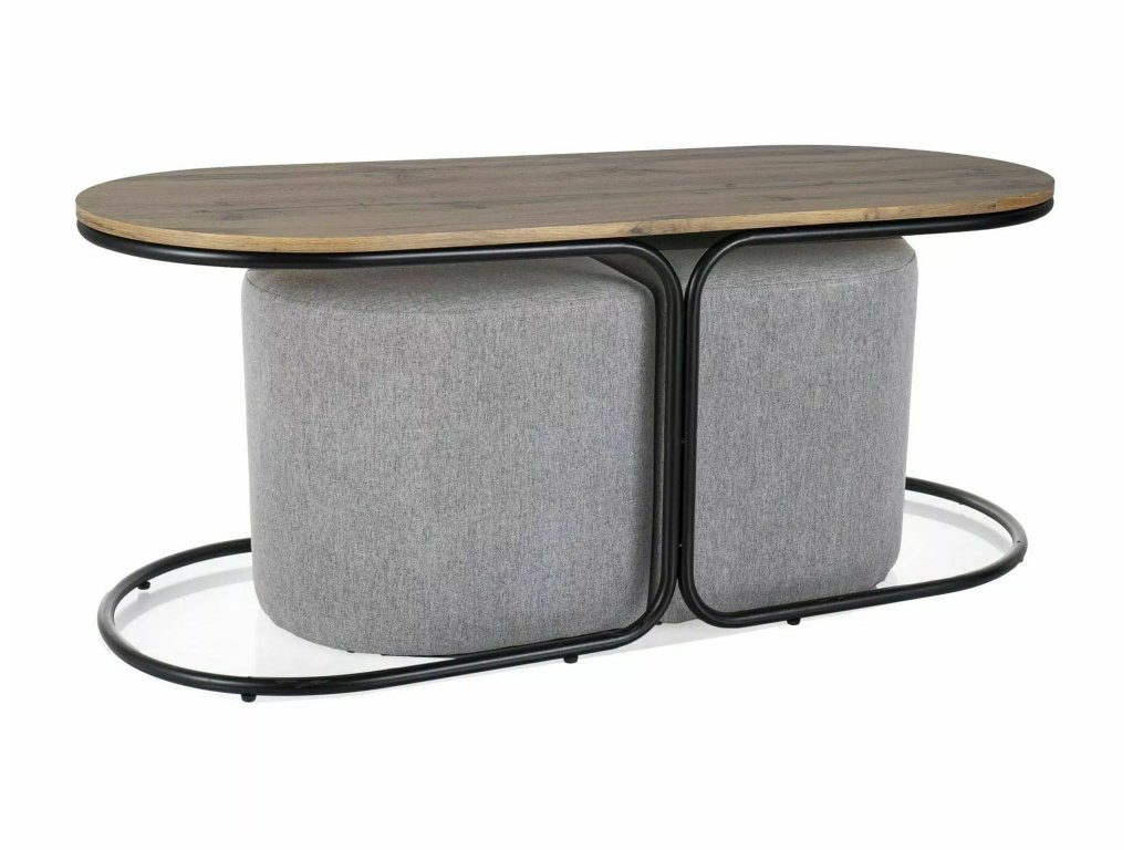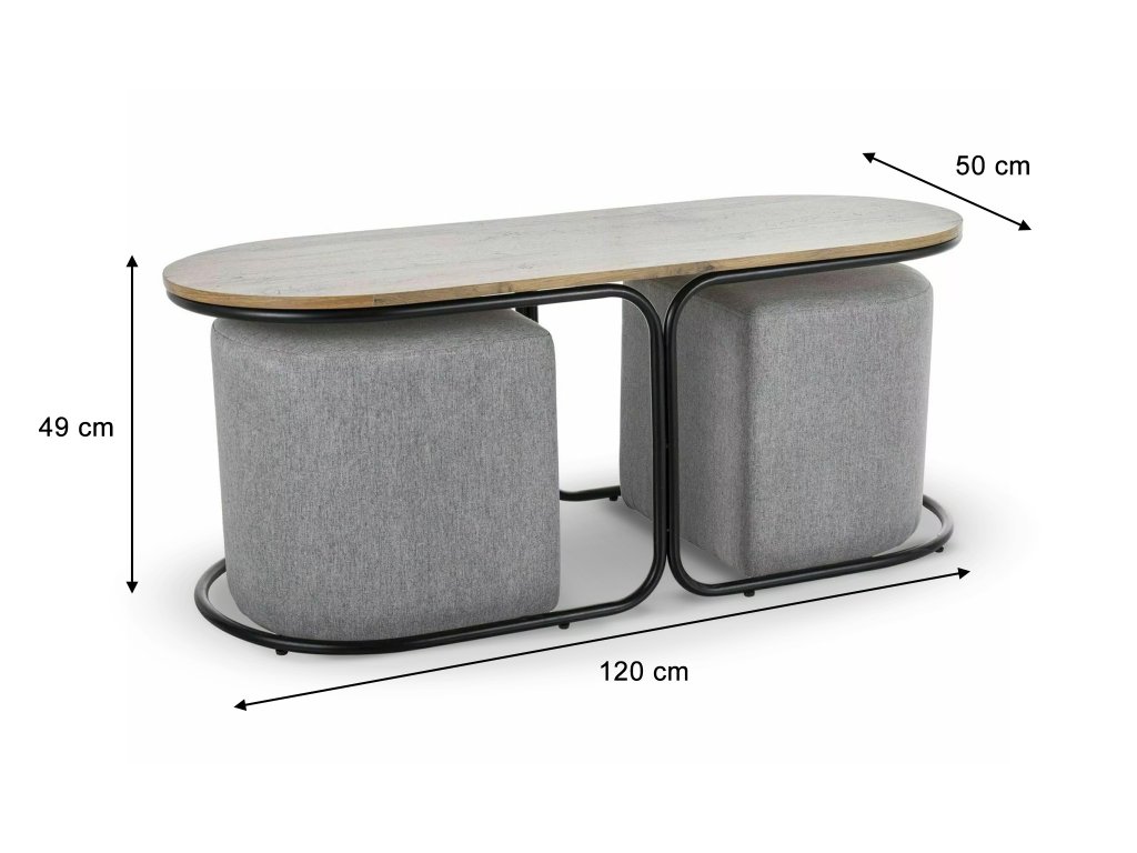 Hľadáte praktické riešenie do obývačky? Súprava konferenčného stolíka a taburetiek je riešením pre menšie aj väčšie interiéri. Konferenčný stolík je vyrobený z kvalitnej MDF dyhovanej dosky a kovových matných nožičiek. Oválny tvar dizajnovo zapasuje ku každému nábytku. Konferenčný stolík vás prekvapí najmä praktickým uložením oboch taburetiek. Zmestia sa pod celú vrchnú dosku, čo uľahčí jeho používanie. Navyše stolík s taburetkami nezaberie veľa miesta. Farba vrchnej dosky pripomínajúcej dub artisan zapadne do každej domácnosti. Taburetky v sivej farbe sú vyrobené z kvalitného materiálu čalúnené príjemnou látkou. Súprava sa hodí do obývačky aj jedálne.