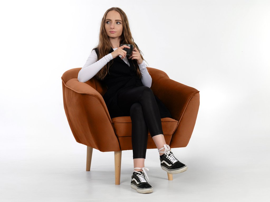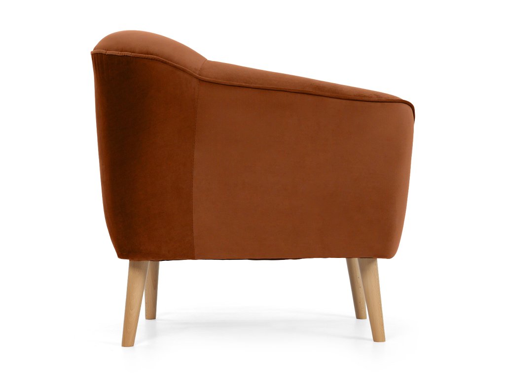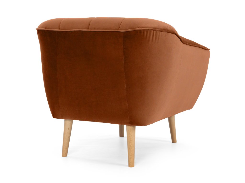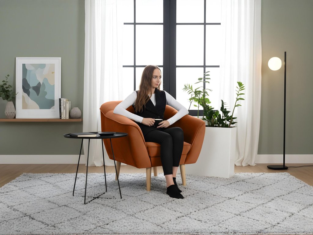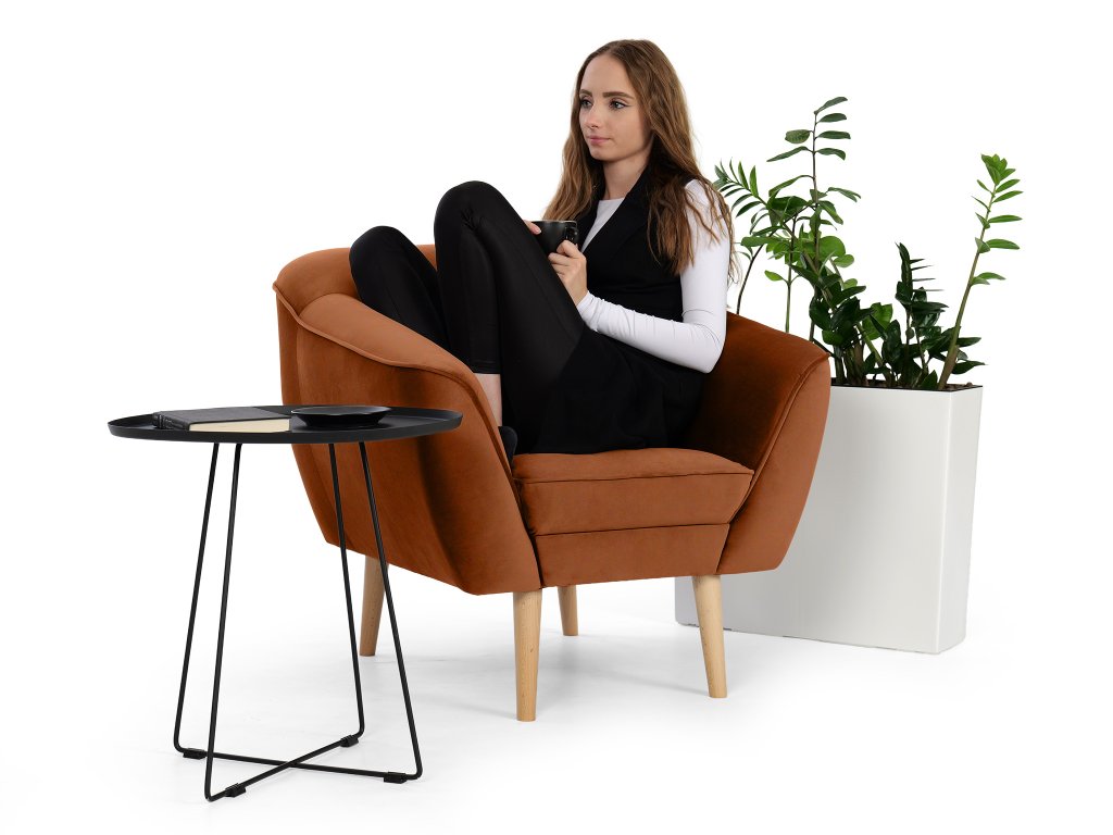 Čalúnené kreslo Diva v tehlovom odtieni okamžite upúta svojím moderným vzhľadom a precíznym prešívaním na operadle. Jemná látka Riviera, z ktorej je kreslo čalúnené, patrí medzi kvalitné velúrové materiály. Je mäkká na dotyk, no zároveň mimoriadne odolná voči opotrebovaniu, žmolkovaniu či rozťahovaniu. Tehlová farba dodáva jedinečný štýl, vďaka čomu sa kreslo Diva stane prirodzeným doplnkom vašej obývačky, čítacieho kútika aj kancelárie.