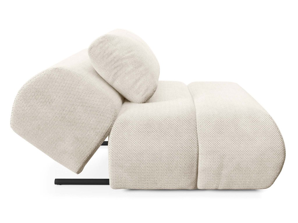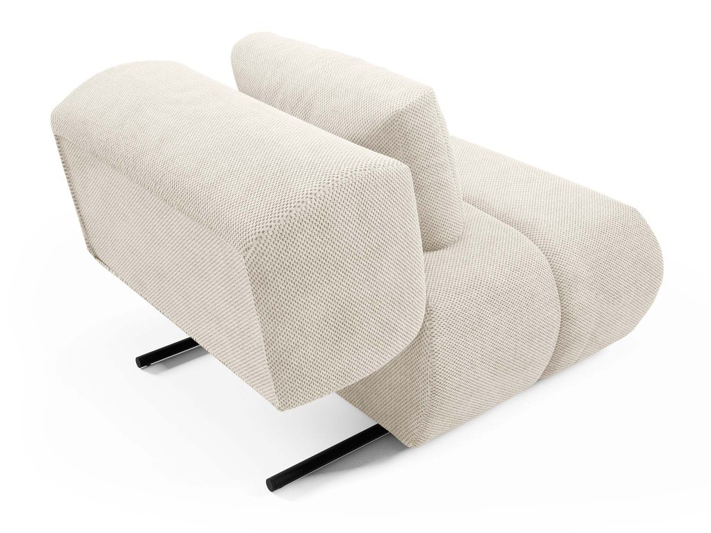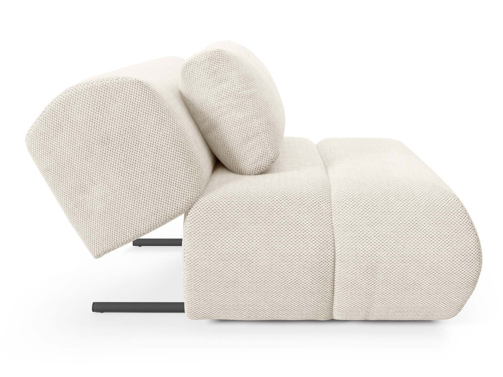 Robustná konštrukcia z borovicového dreva a drevotriesky zaručuje stabilitu a dlhú životnosť, zatiaľ čo výplň z PUR peny poskytuje príjemný komfort, ktorý si uchová tvar aj po dlhodobom používaní. Mäkký poťah je nielen na dotyk príjemný, ale aj vizuálne čistý a elegantný – krémový odtieň sa ľahko kombinuje s akýmkoľvek interiérom. Pohovka stojí na čiernych kovových koľajkách.